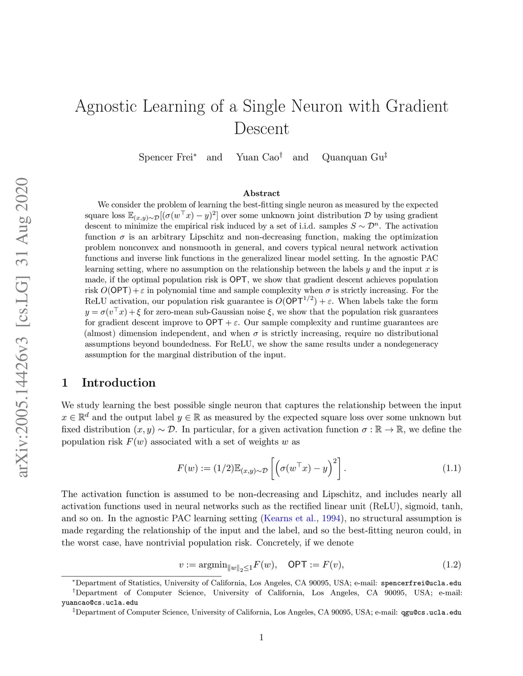 We consider the problem of learning the best-fitting single neuron as measured by the expected square loss over some unknown joint distribution by using gradient descent to minimize the empirical risk induced by a set of i.i.d. samples . The activation function is an arbitrary Lipschitz and non-decreasing function, making the optimization problem nonconvex and nonsmooth in general, and covers typical neural network activation functions and inverse link functions in the generalized linear model setting. In the agnostic PAC learning setting, where no assumption on the relationship between the labels and the input is made, if the optimal population risk is , we show that gradient descent achieves population risk in polynomial time and sample complexity. When labels take the form for zero-mean sub-Gaussian noise , we show that gradient descent achieves population risk . Our sample complexity and runtime guarantees are (almost) dimension independent, and when is strictly increasing and Lipschitz, require no distributional assumptions beyond boundedness. For ReLU, we show the same results under a nondegeneracy assumption for the marginal distribution of the input. To the best of our knowledge, this is the first result for agnostic learning of a single neuron using gradient descent.