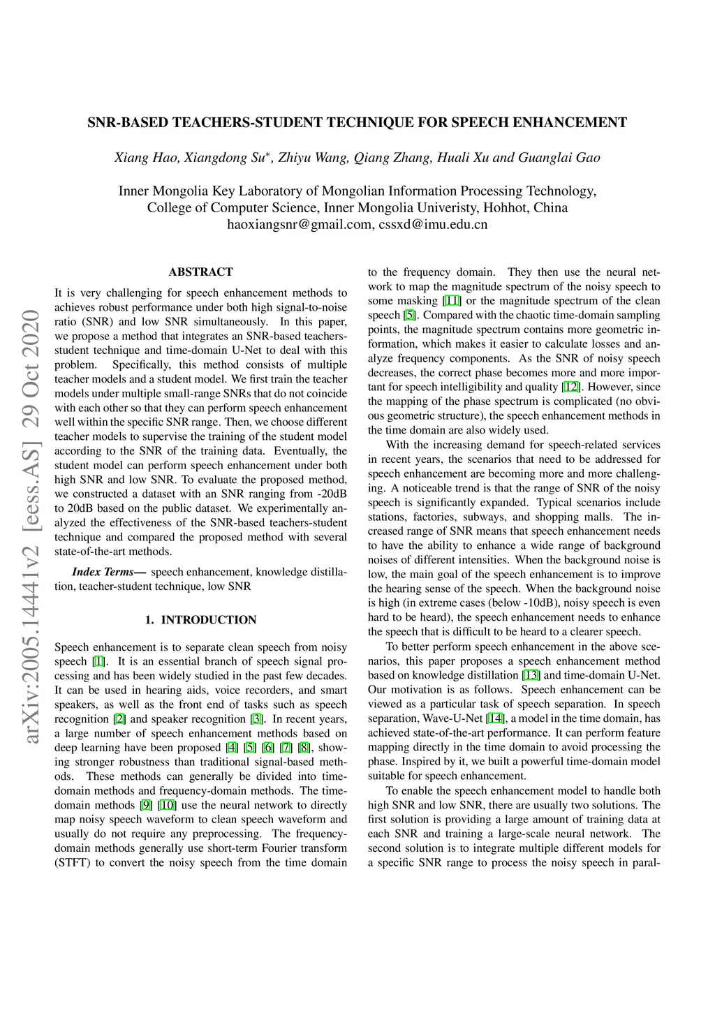 SNR-Based Teachers-Student Technique for Speech Enhancement