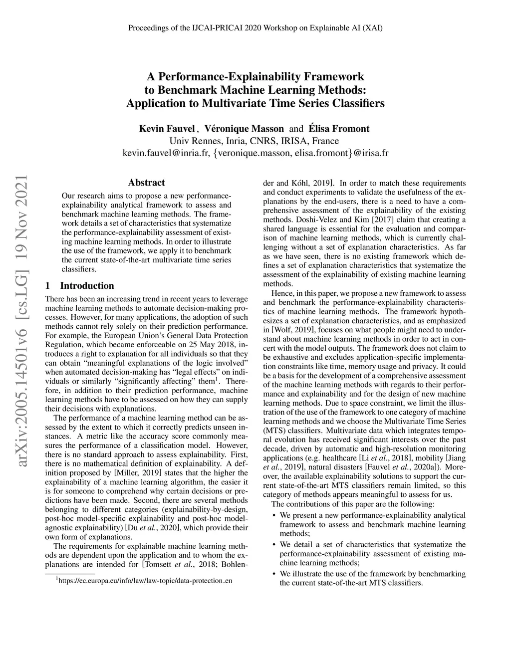Our research aims to propose a new performance-explainability analytical framework to assess and benchmark machine learning methods. The framework details a set of characteristics that systematize the performance-explainability assessment of existing machine learning methods. In order to illustrate the use of the framework, we apply it to benchmark the current state-of-the-art multivariate time series classifiers.