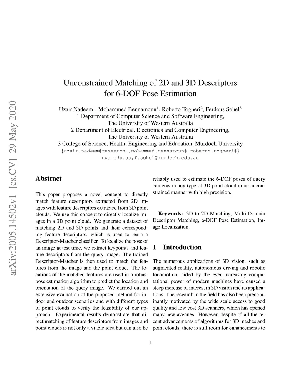 Unconstrained Matching of 2D and 3D Descriptors for 6-DOF Pose