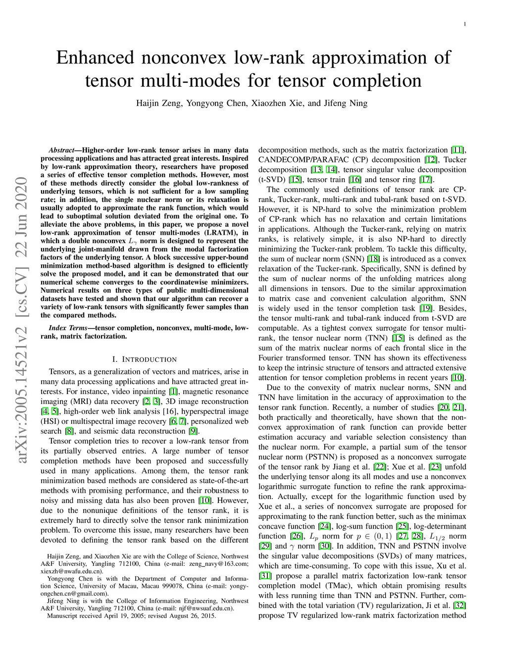 Higher-order low-rank tensor arises in many data processing applications and has attracted great interests. Inspired by low-rank approximation theory, researchers have proposed a series of effective tensor completion methods. However, most of these methods directly consider the global low-rankness of underlying tensors, which is not sufficient for a low sampling rate; in addition, the single nuclear norm or its relaxation is usually adopted to approximate the rank function, which would lead to suboptimal solution deviated from the original one. To alleviate the above problems, in this paper, we propose a novel low-rank approximation of tensor multi-modes (LRATM), in which a double nonconvex norm is designed to represent the underlying joint-manifold drawn from the modal factorization factors of the underlying tensor. A block successive upper-bound minimization method-based algorithm is designed to efficiently solve the proposed model, and it can be demonstrated that our numerical scheme converges to the coordinatewise minimizers. Numerical results on three types of public multi-dimensional datasets have tested and shown that our algorithm can recover a variety of low-rank tensors with significantly fewer samples than the compared methods.