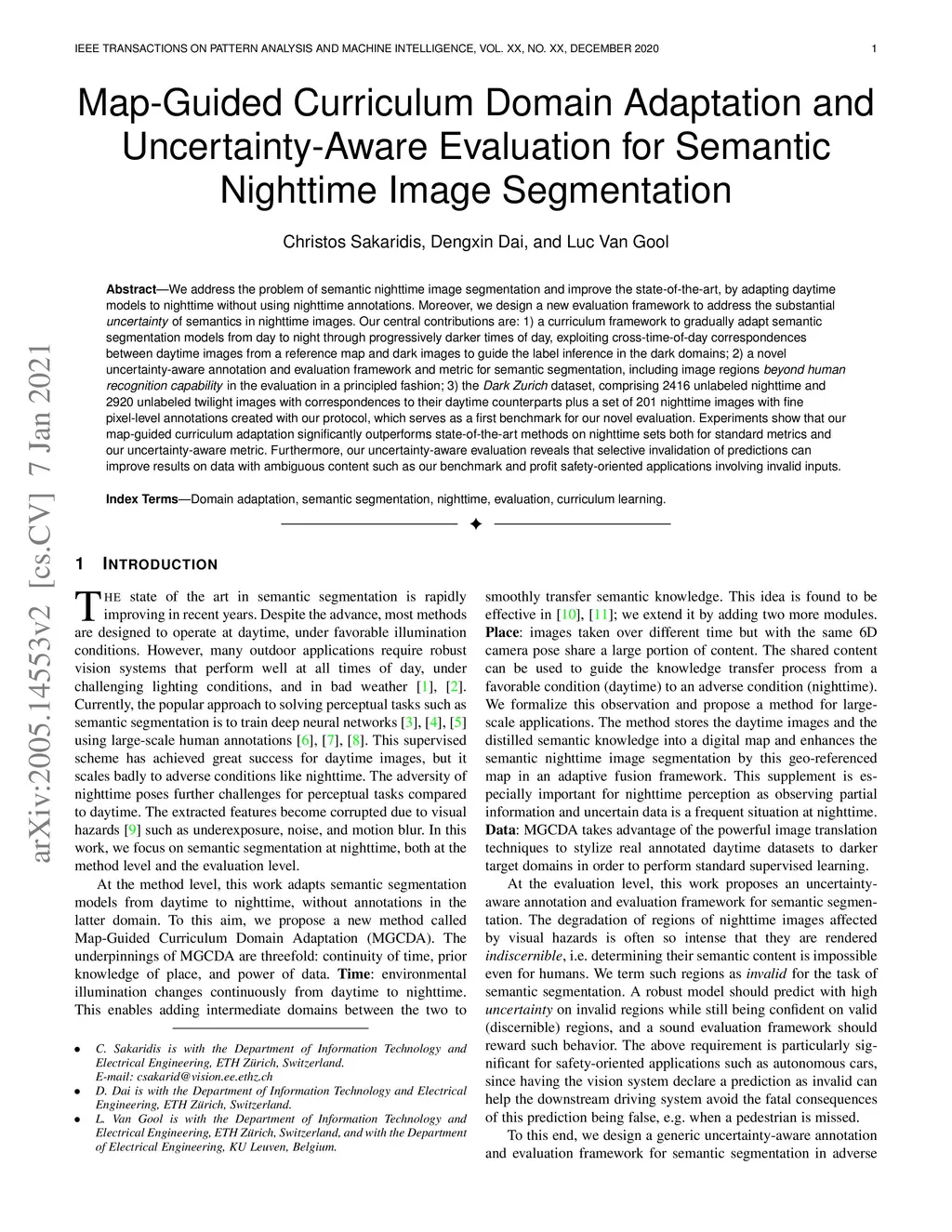 We address the problem of semantic nighttime image segmentation and improve the state-of-the-art, by adapting daytime models to nighttime without using nighttime annotations. Moreover, we design a new evaluation framework to address the substantial uncertainty of semantics in nighttime images. Our central contributions are: 1) a curriculum framework to gradually adapt semantic segmentation models from day to night through progressively darker times of day, exploiting cross-time-of-day correspondences between daytime images from a reference map and dark images to guide the label inference in the dark domains; 2) a novel uncertainty-aware annotation and evaluation framework and metric for semantic segmentation, including image regions beyond human recognition capability in the evaluation in a principled fashion; 3) the Dark Zurich dataset, comprising 2416 unlabeled nighttime and 2920 unlabeled twilight images with correspondences to their daytime counterparts plus a set of 201 nighttime images with fine pixel-level annotations created with our protocol, which serves as a first benchmark for our novel evaluation. Experiments show that our map-guided curriculum adaptation significantly outperforms state-of-the-art methods on nighttime sets both for standard metrics and our uncertainty-aware metric. Furthermore, our uncertainty-aware evaluation reveals that selective invalidation of predictions can improve results on data with ambiguous content such as our benchmark and profit safety-oriented applications involving invalid inputs.
