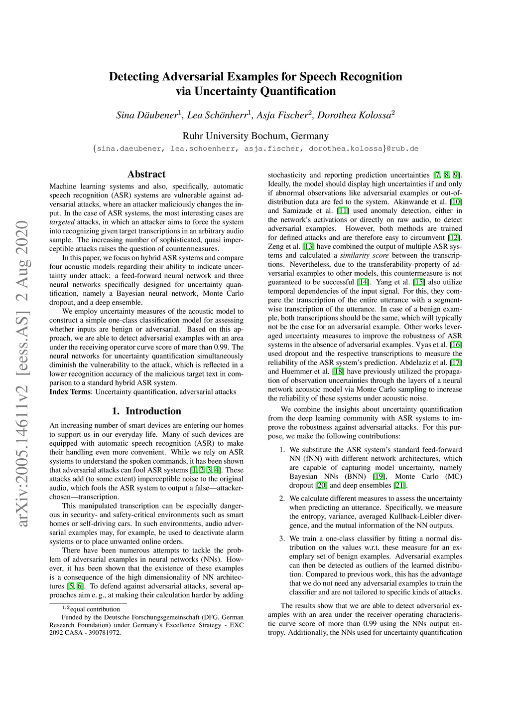 Machine learning systems and also, specifically, automatic speech recognition (ASR) systems are vulnerable against adversarial attacks, where an attacker maliciously changes the input. In the case of ASR systems, the most interesting cases are targeted attacks, in which an attacker aims to force the system into recognizing given target transcriptions in an arbitrary audio sample. The increasing number of sophisticated, quasi imperceptible attacks raises the question of countermeasures. In this paper, we focus on hybrid ASR systems and compare four acoustic models regarding their ability to indicate uncertainty under attack: a feed-forward neural network and three neural networks specifically designed for uncertainty quantification, namely a Bayesian neural network, Monte Carlo dropout, and a deep ensemble. We employ uncertainty measures of the acoustic model to construct a simple one-class classification model for assessing whether inputs are benign or adversarial. Based on this approach, we are able to detect adversarial examples with an area under the receiving operator curve score of more than 0.99. The neural networks for uncertainty quantification simultaneously diminish the vulnerability to the attack, which is reflected in a lower recognition accuracy of the malicious target text in comparison to a standard hybrid ASR system.
