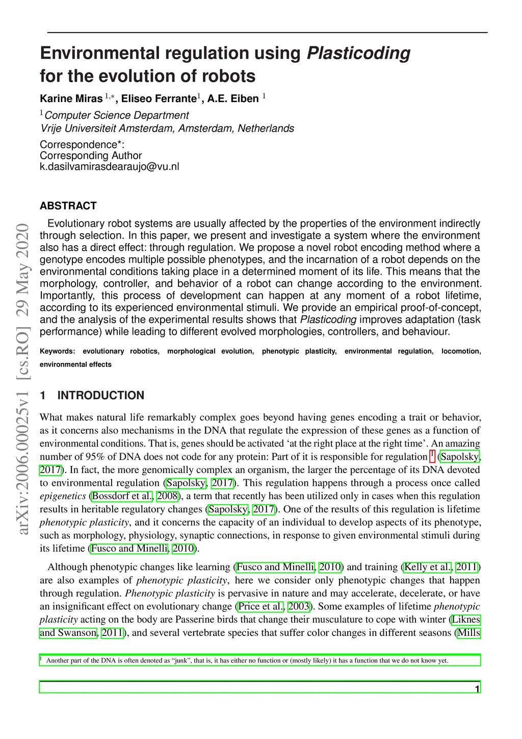 Evolutionary robot systems are usually affected by the properties of the environment indirectly through selection. In this paper, we present and investigate a system where the environment also has a direct effect: through regulation. We propose a novel robot encoding method where a genotype encodes multiple possible phenotypes, and the incarnation of a robot depends on the environmental conditions taking place in a determined moment of its life. This means that the morphology, controller, and behavior of a robot can change according to the environment. Importantly, this process of development can happen at any moment of a robot lifetime, according to its experienced environmental stimuli. We provide an empirical proof-of-concept, and the analysis of the experimental results shows that Plasticoding improves adaptation (task performance) while leading to different evolved morphologies, controllers, and behaviour.