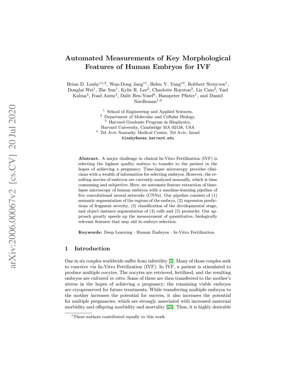 A major challenge in clinical In-Vitro Fertilization (IVF) is selecting the highest quality embryo to transfer to the patient in the hopes of achieving a pregnancy. Time-lapse microscopy provides clinicians with a wealth of information for selecting embryos. However, the resulting movies of embryos are currently analyzed manually, which is time consuming and subjective. Here, we automate feature extraction of time-lapse microscopy of human embryos with a machine-learning pipeline of five convolutional neural networks (CNNs). Our pipeline consists of (1) semantic segmentation of the regions of the embryo, (2) regression predictions of fragment severity, (3) classification of the developmental stage, and object instance segmentation of (4) cells and (5) pronuclei. Our approach greatly speeds up the measurement of quantitative, biologically relevant features that may aid in embryo selection.