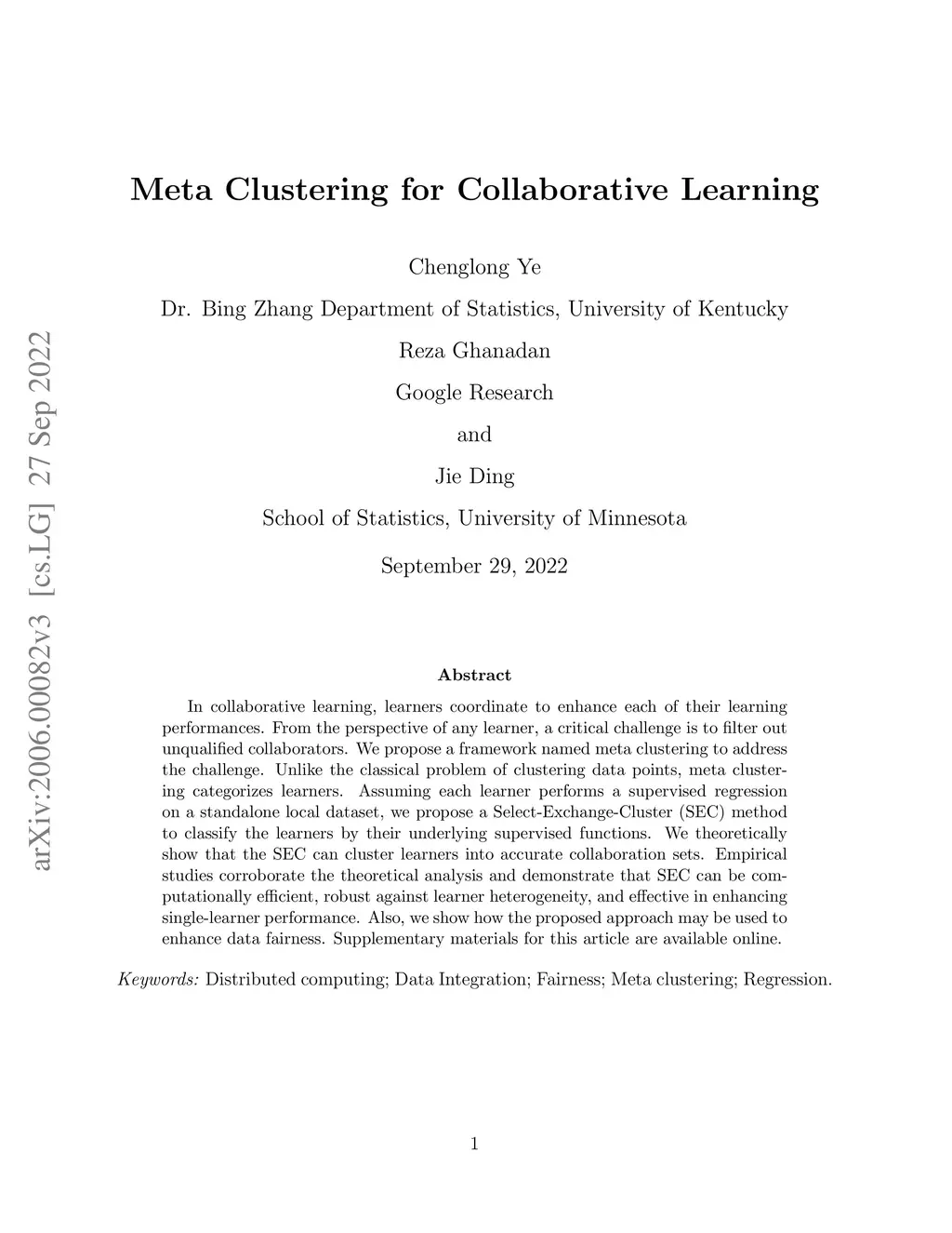 In collaborative learning, learners coordinate to enhance each of their learning performances. From the perspective of any learner, a critical challenge is to filter out unqualified collaborators. We propose a framework named meta clustering to address the challenge. Unlike the classical problem of clustering data points, meta clustering categorizes learners. Assuming each learner performs a supervised regression on a standalone local dataset, we propose a Select-Exchange-Cluster (SEC) method to classify the learners by their underlying supervised functions. We theoretically show that the SEC can cluster learners into accurate collaboration sets. Empirical studies corroborate the theoretical analysis and demonstrate that SEC can be computationally efficient, robust against learner heterogeneity, and effective in enhancing single-learner performance. Also, we show how the proposed approach may be used to enhance data fairness. Supplementary materials for this article are available online.