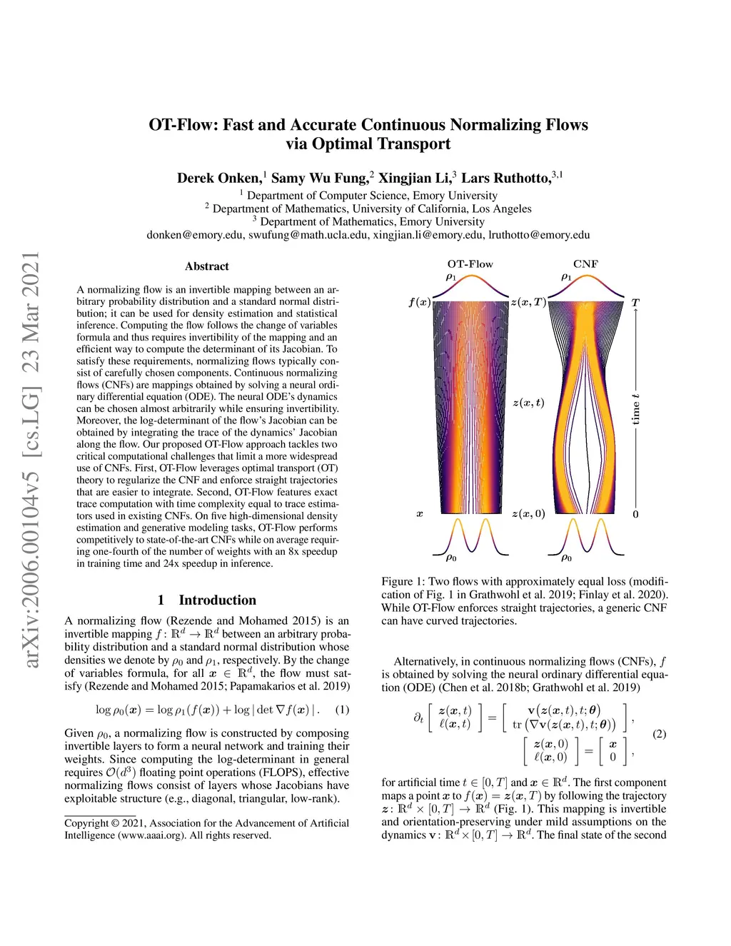 A normalizing flow is an invertible mapping between an arbitrary probability distribution and a standard normal distribution; it can be used for density estimation and statistical inference. Computing the flow follows the change of variables formula and thus requires invertibility of the mapping and an efficient way to compute the determinant of its Jacobian. To satisfy these requirements, normalizing flows typically consist of carefully chosen components. Continuous normalizing flows (CNFs) are mappings obtained by solving a neural ordinary differential equation (ODE). The neural ODE's dynamics can be chosen almost arbitrarily while ensuring invertibility. Moreover, the log-determinant of the flow's Jacobian can be obtained by integrating the trace of the dynamics' Jacobian along the flow. Our proposed OT-Flow approach tackles two critical computational challenges that limit a more widespread use of CNFs. First, OT-Flow leverages optimal transport (OT) theory to regularize the CNF and enforce straight trajectories that are easier to integrate. Second, OT-Flow features exact trace computation with time complexity equal to trace estimators used in existing CNFs. On five high-dimensional density estimation and generative modeling tasks, OT-Flow performs competitively to state-of-the-art CNFs while on average requiring one-fourth of the number of weights with an 8x speedup in training time and 24x speedup in inference.