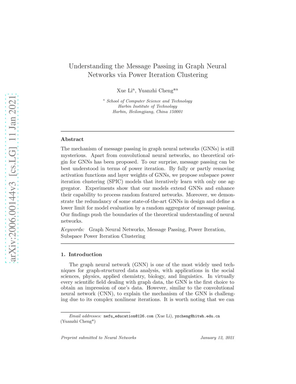 The mechanism of message passing in graph neural networks (GNNs) is still mysterious. Apart from convolutional neural networks, no theoretical origin for GNNs has been proposed. To our surprise, message passing can be best understood in terms of power iteration. By fully or partly removing activation functions and layer weights of GNNs, we propose subspace power iteration clustering (SPIC) models that iteratively learn with only one aggregator. Experiments show that our models extend GNNs and enhance their capability to process random featured networks. Moreover, we demonstrate the redundancy of some state-of-the-art GNNs in design and define a lower limit for model evaluation by a random aggregator of message passing. Our findings push the boundaries of the theoretical understanding of neural networks.