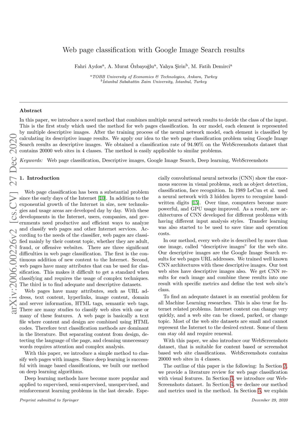 In this paper, we introduce a novel method that combines multiple neural network results to decide the class of the input. This is the first study which used the method for web pages classification. In our model, each element is represented by multiple descriptive images. After the training process of the neural network model, each element is classified by calculating its descriptive image results. We apply our idea to the web page classification problem using Google Image Search results as descriptive images. We obtained a classification rate of 94.90% on the WebScreenshots dataset that contains 20000 web sites in 4 classes. The method is easily applicable to similar problems.