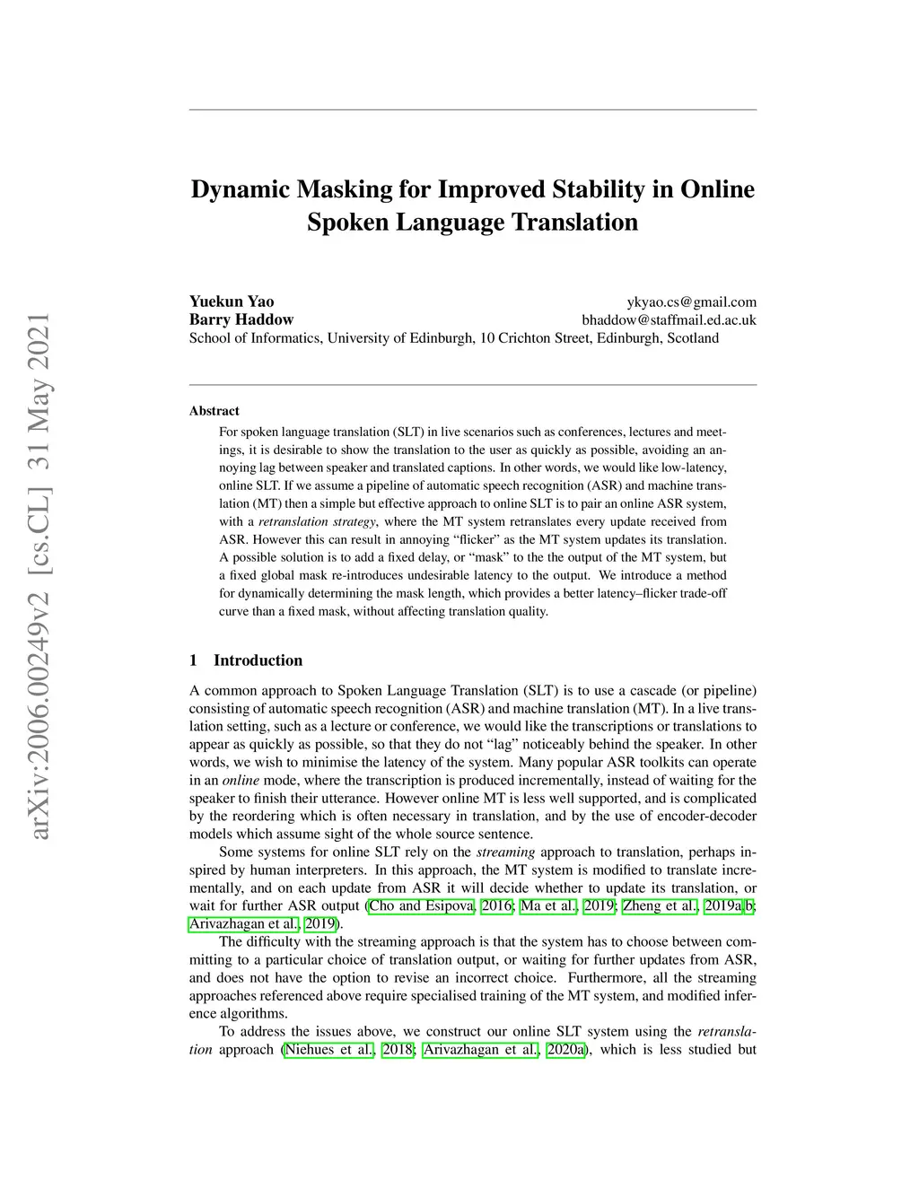 For spoken language translation (SLT) in live scenarios such as conferences, lectures and meetings, it is desirable to show the translation to the user as quickly as possible, avoiding an annoying lag between speaker and translated captions. In other words, we would like low-latency, online SLT. If we assume a pipeline of automatic speech recognition (ASR) and machine translation (MT) then a viable approach to online SLT is to pair an online ASR system, with a a retranslation strategy, where the MT system re-translates every update received from ASR. However this can result in annoying "flicker" as the MT system updates its translation. A possible solution is to add a fixed delay, or "mask" to the the output of the MT system, but a fixed global mask introduces undesirable latency to the output. We show how this mask can be set dynamically, improving the latency-flicker trade-off without sacrificing translation quality.