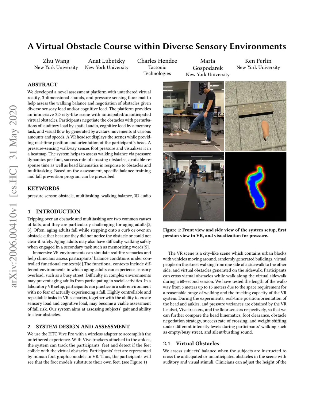We developed a novel assessment platform with untethered virtual reality, 3-dimensional sounds, and pressure sensing floor mat to help assess the walking balance and negotiation of obstacles given diverse sensory load and/or cognitive load. The platform provides an immersive 3D city-like scene with anticipated/unanticipated virtual obstacles. Participants negotiate the obstacles with perturbations of: auditory load by spatial audio, cognitive load by a memory task, and visual flow by generated by avatars movements at various amounts and speeds. A VR headset displays the scenes while providing real-time position and orientation of the participant's head. A pressure-sensing walkway senses foot pressure and visualizes it in a heatmap. The system helps to assess walking balance via pressure dynamics per foot, success rate of crossing obstacles, available response time as well as head kinematics in response to obstacles and multitasking. Based on the assessment, specific balance training and fall prevention program can be prescribed.