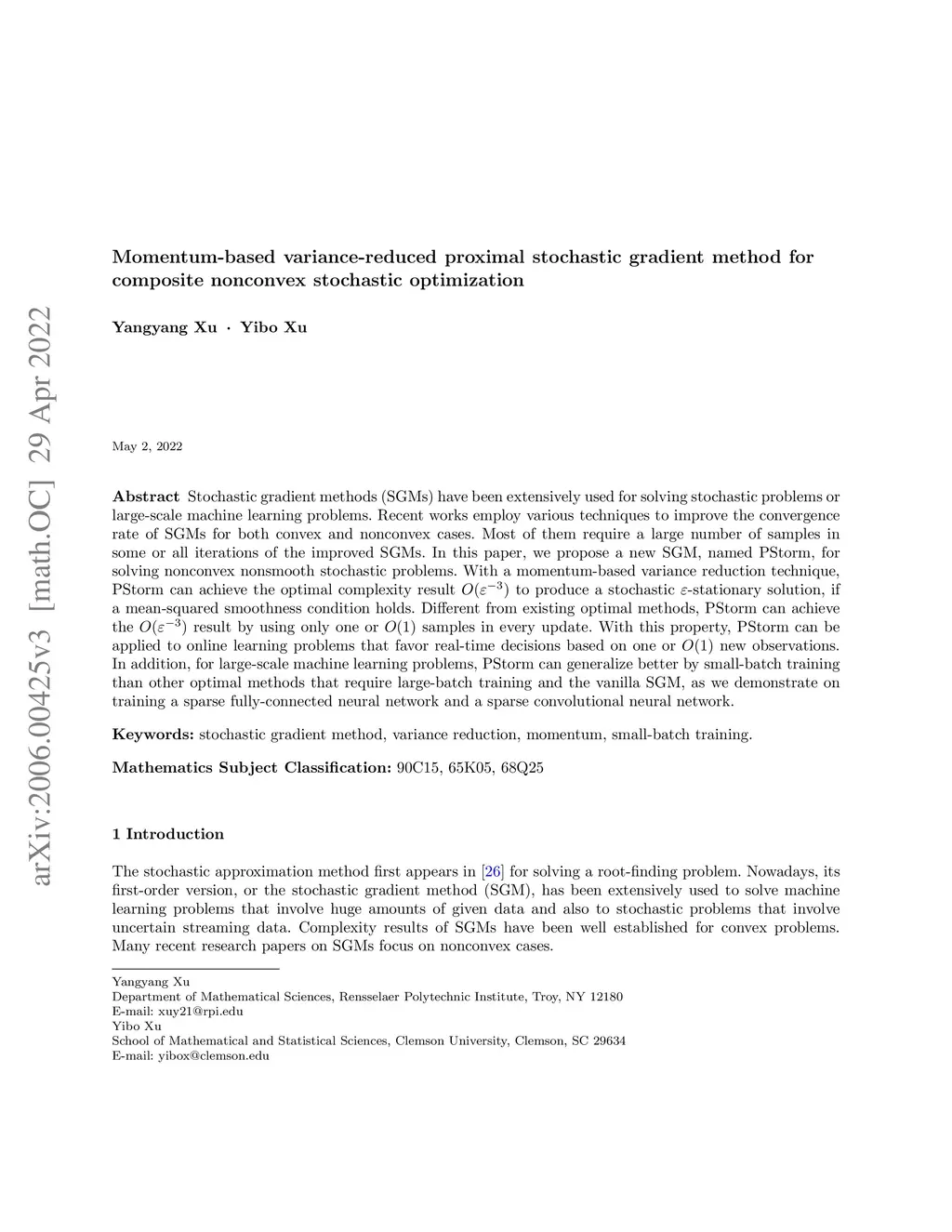 Stochastic gradient methods (SGMs) have been extensively used for solving stochastic problems or large-scale machine learning problems. Recent works employ various techniques to improve the convergence rate of SGMs for both convex and nonconvex cases. Most of them require a large number of samples in some or all iterations of the improved SGMs. In this paper, we propose a new SGM, named PStorm, for solving nonconvex nonsmooth stochastic problems. With a momentum-based variance reduction technique, PStorm can achieve the optimal complexity result to produce a stochastic -stationary solution, if a mean-squared smoothness condition holds. Different from existing optimal methods, PStorm can achieve the result by using only one or samples in every update. With this property, PStorm can be applied to online learning problems that favor real-time decisions based on one or new observations. In addition, for large-scale machine learning problems, PStorm can generalize better by small-batch training than other optimal methods that require large-batch training and the vanilla SGM, as we demonstrate on training a sparse fully-connected neural network and a sparse convolutional neural network.