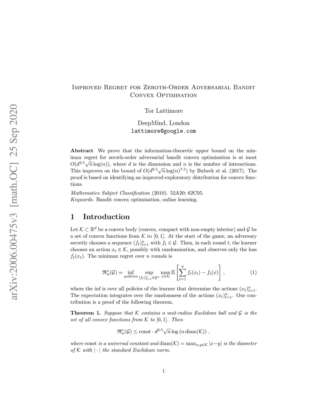 We prove that the information-theoretic upper bound on the minimax regret for zeroth-order adversarial bandit convex optimisation is at most , where is the dimension and is the number of interactions. This improves on by Bubeck et al. (2017). The proof is based on identifying an improved exploratory distribution for convex functions.