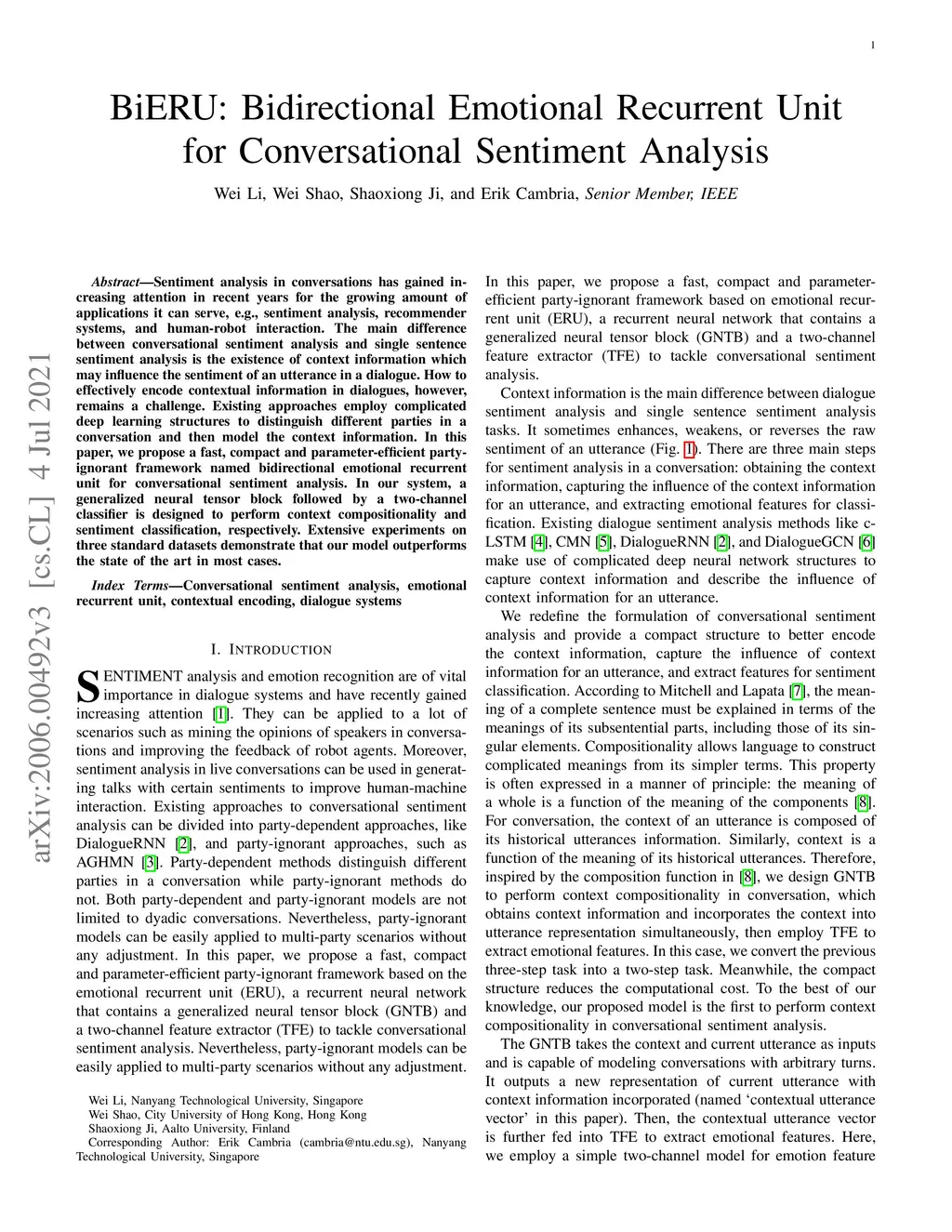 BiERU: Bidirectional Emotional Recurrent Unit for Conversational