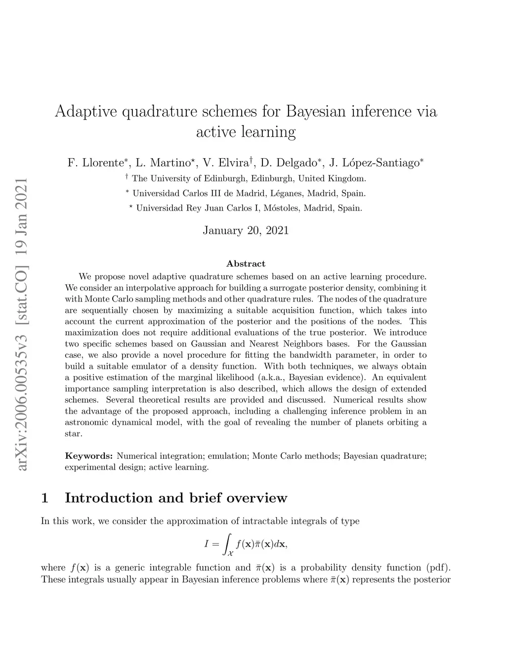 Numerical integration and emulation are fundamental topics across scientific fields. We propose novel adaptive quadrature schemes based on an active learning procedure. We consider an interpolative approach for building a surrogate posterior density, combining it with Monte Carlo sampling methods and other quadrature rules. The nodes of the quadrature are sequentially chosen by maximizing a suitable acquisition function, which takes into account the current approximation of the posterior and the positions of the nodes. This maximization does not require additional evaluations of the true posterior. We introduce two specific schemes based on Gaussian and Nearest Neighbors (NN) bases. For the Gaussian case, we also provide a novel procedure for fitting the bandwidth parameter, in order to build a suitable emulator of a density function. With both techniques, we always obtain a positive estimation of the marginal likelihood (a.k.a., Bayesian evidence). An equivalent importance sampling interpretation is also described, which allows the design of extended schemes. Several theoretical results are provided and discussed. Numerical results show the advantage of the proposed approach, including a challenging inference problem in an astronomic dynamical model, with the goal of revealing the number of planets orbiting a star.