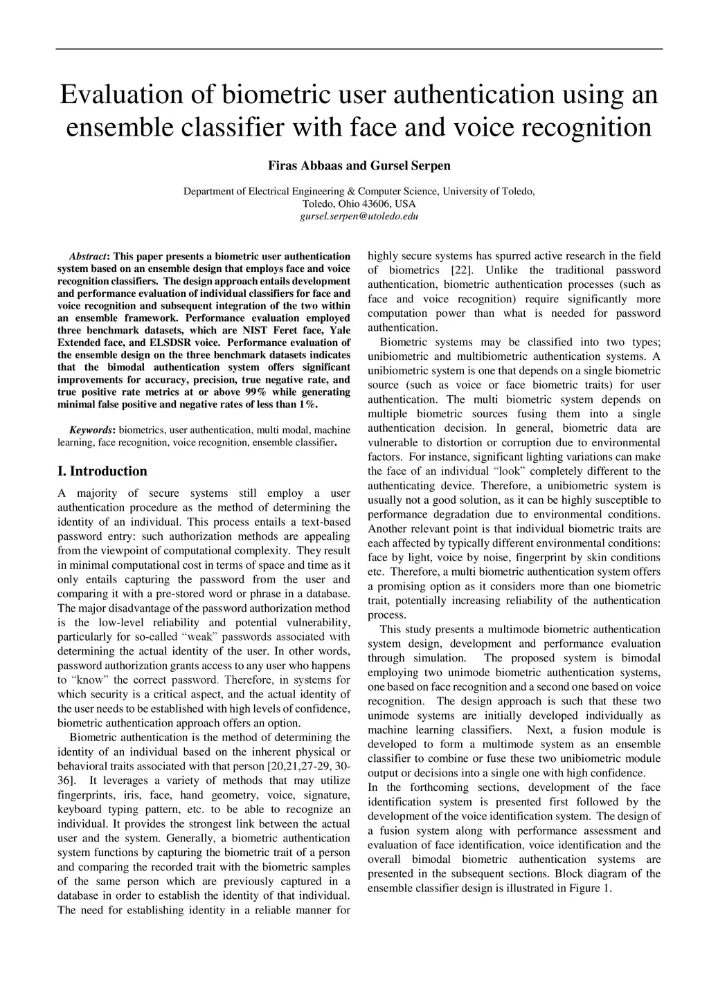 This paper presents a biometric user authentication system based on an ensemble design that employs face and voice recognition classifiers. The design approach entails development and performance evaluation of individual classifiers for face and voice recognition and subsequent integration of the two within an ensemble framework. Performance evaluation employed three benchmark datasets, which are NIST Feret face, Yale Extended face, and ELSDSR voice. Performance evaluation of the ensemble design on the three benchmark datasets indicates that the bimodal authentication system offers significant improvements for accuracy, precision, true negative rate, and true positive rate metrics at or above 99% while generating minimal false positive and negative rates of less than 1%.