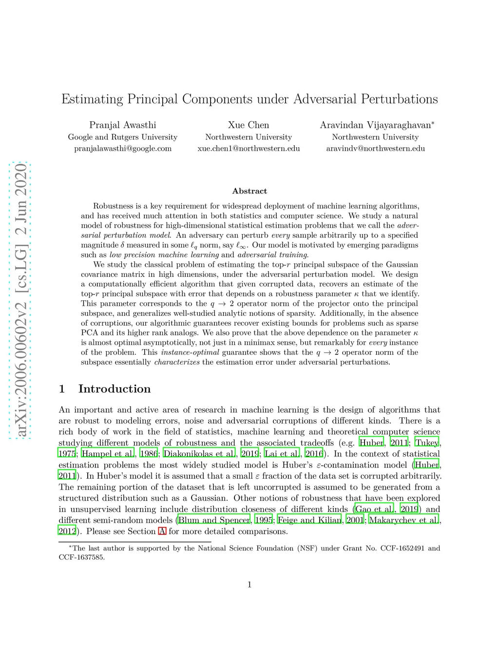 Robustness is a key requirement for widespread deployment of machine learning algorithms, and has received much attention in both statistics and computer science. We study a natural model of robustness for high-dimensional statistical estimation problems that we call the adversarial perturbation model. An adversary can perturb every sample arbitrarily up to a specified magnitude measured in some norm, say . Our model is motivated by emerging paradigms such as low precision machine learning and adversarial training. We study the classical problem of estimating the top- principal subspace of the Gaussian covariance matrix in high dimensions, under the adversarial perturbation model. We design a computationally efficient algorithm that given corrupted data, recovers an estimate of the top- principal subspace with error that depends on a robustness parameter that we identify. This parameter corresponds to the operator norm of the projector onto the principal subspace, and generalizes well-studied analytic notions of sparsity. Additionally, in the absence of corruptions, our algorithmic guarantees recover existing bounds for problems such as sparse PCA and its higher rank analogs. We also prove that the above dependence on the parameter is almost optimal asymptotically, not just in a minimax sense, but remarkably for every instance of the problem. This instance-optimal guarantee shows that the operator norm of the subspace essentially characterizes the estimation error under adversarial perturbations.