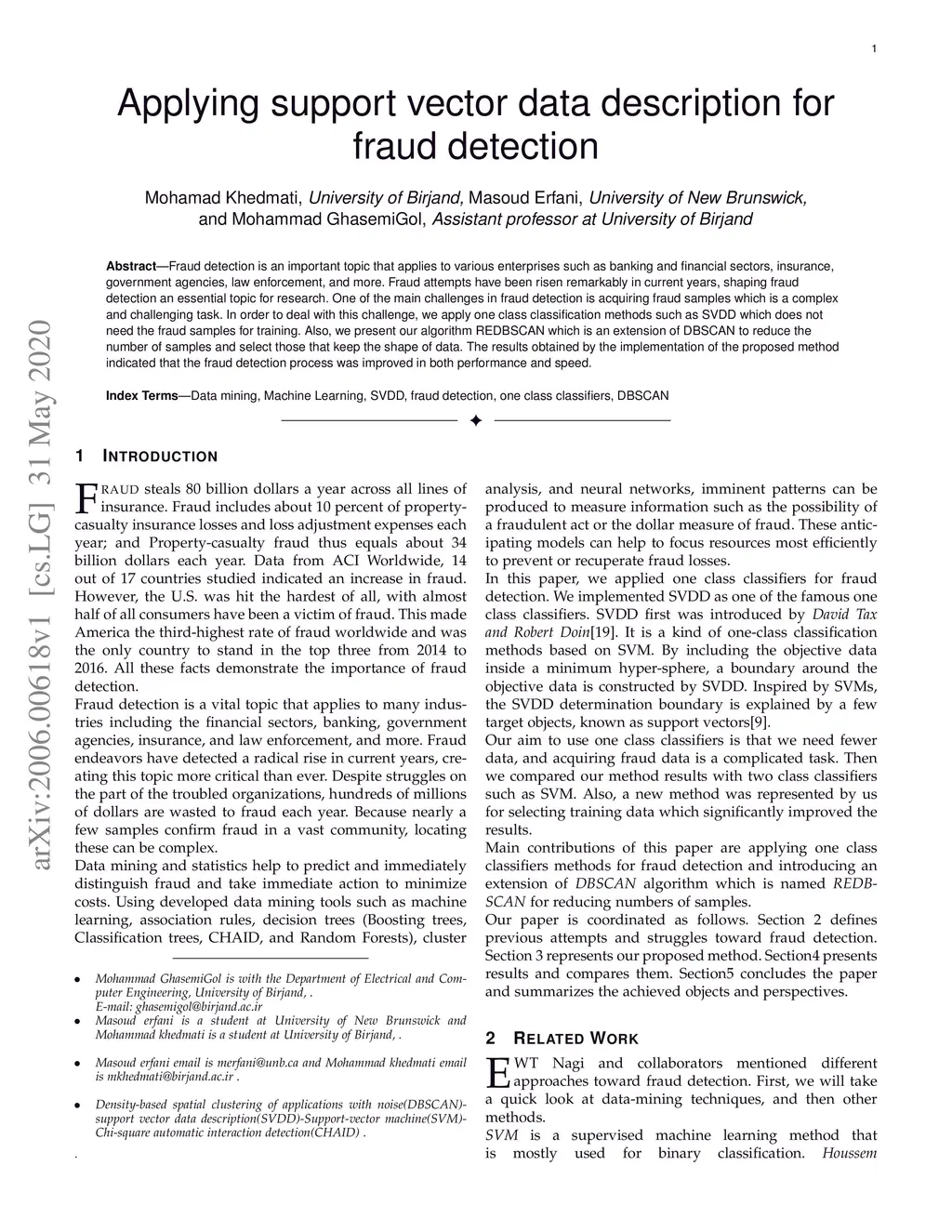 Fraud detection is an important topic that applies to various enterprises such as banking and financial sectors, insurance, government agencies, law enforcement, and more. Fraud attempts have been risen remarkably in current years, shaping fraud detection an essential topic for research. One of the main challenges in fraud detection is acquiring fraud samples which is a complex and challenging task. In order to deal with this challenge, we apply one-class classification methods such as SVDD which does not need the fraud samples for training. Also, we present our algorithm REDBSCAN which is an extension of DBSCAN to reduce the number of samples and select those that keep the shape of data. The results obtained by the implementation of the proposed method indicated that the fraud detection process was improved in both performance and speed.