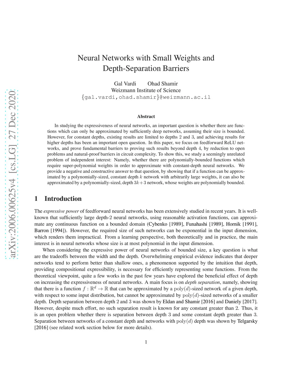Neural Networks with Small Weights and Depth-Separation Barriers