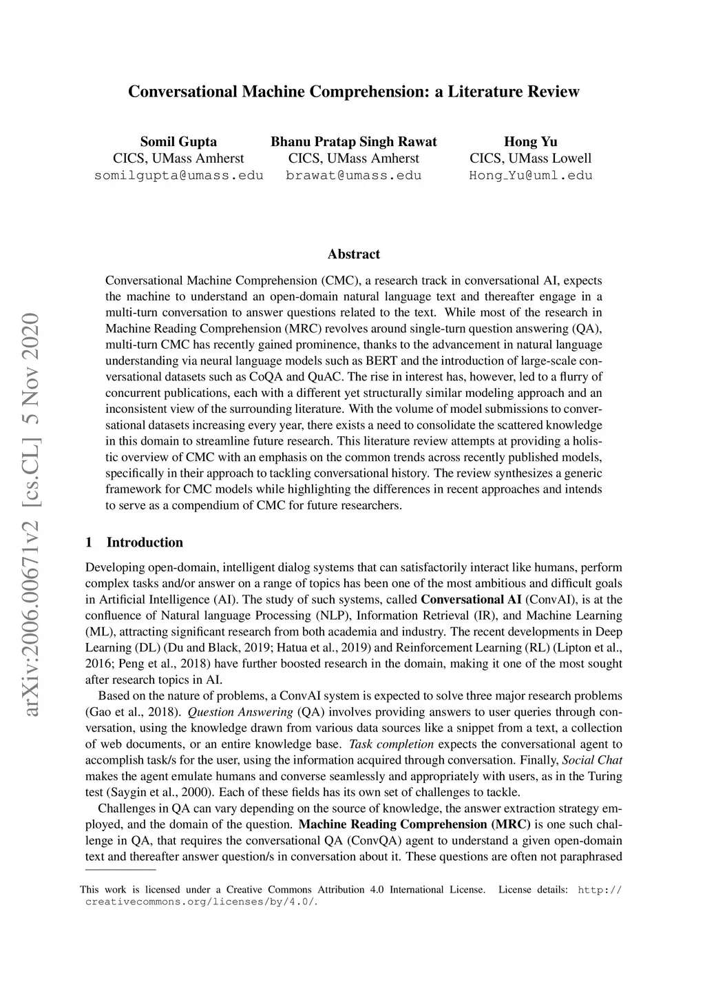 Conversational Machine Comprehension: a Literature Review