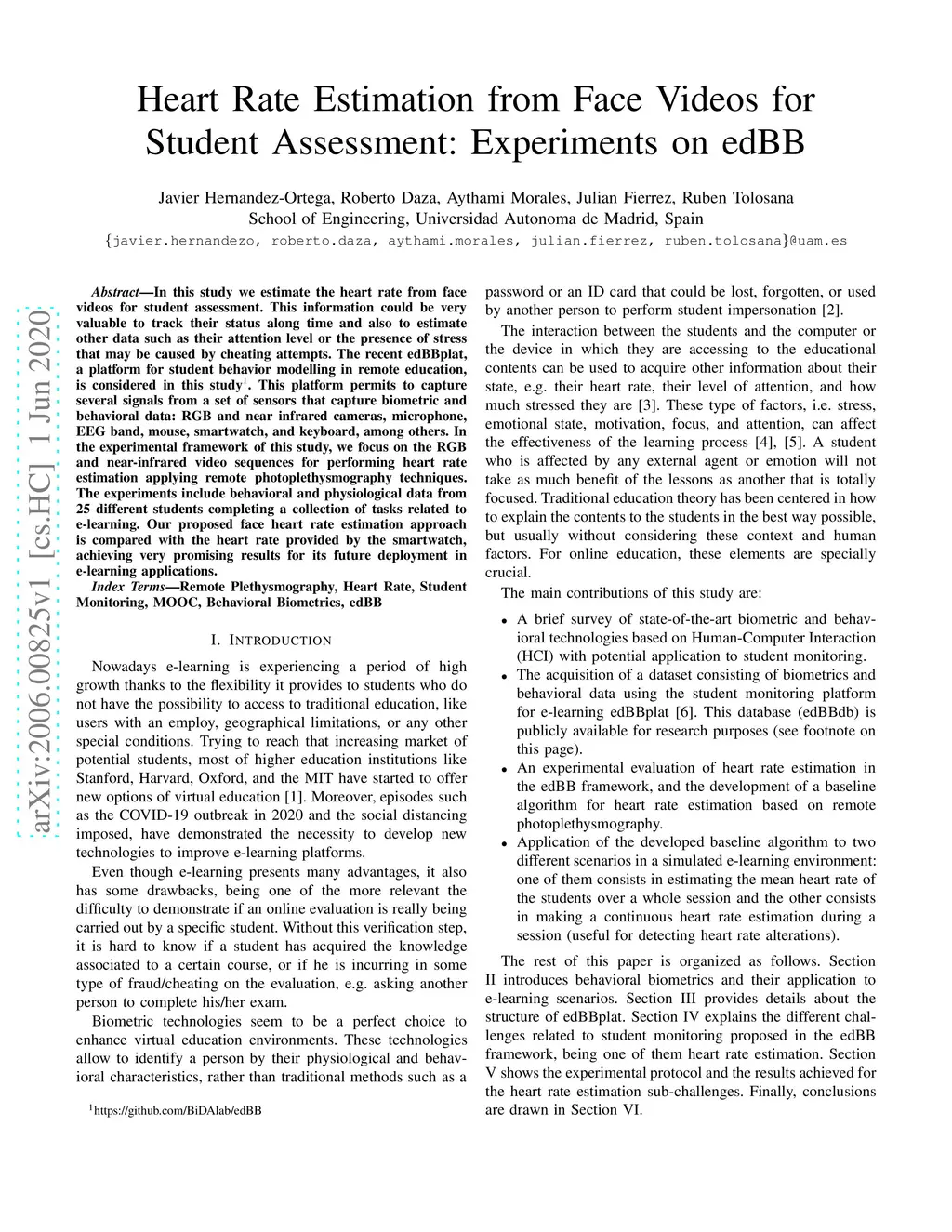In this study we estimate the heart rate from face videos for student assessment. This information could be very valuable to track their status along time and also to estimate other data such as their attention level or the presence of stress that may be caused by cheating attempts. The recent edBBplat, a platform for student behavior modelling in remote education, is considered in this study1. This platform permits to capture several signals from a set of sensors that capture biometric and behavioral data: RGB and near infrared cameras, microphone, EEG band, mouse, smartwatch, and keyboard, among others. In the experimental framework of this study, we focus on the RGB and near-infrared video sequences for performing heart rate estimation applying remote photoplethysmography techniques. The experiments include behavioral and physiological data from 25 different students completing a collection of tasks related to e-learning. Our proposed face heart rate estimation approach is compared with the heart rate provided by the smartwatch, achieving very promising results for its future deployment in e-learning applications.