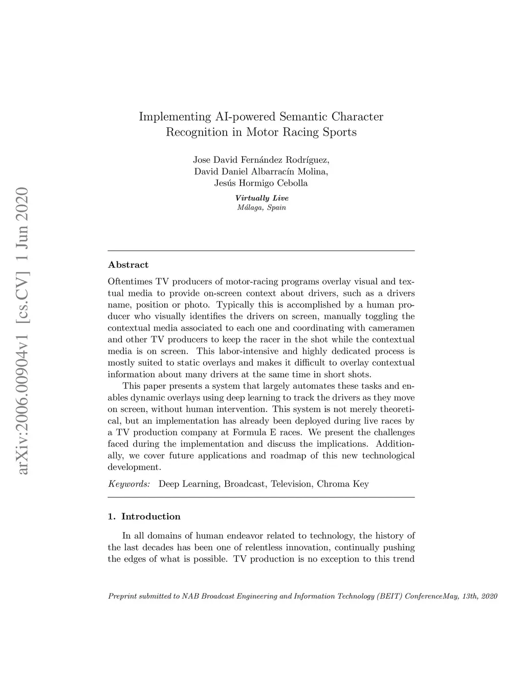 Oftentimes TV producers of motor-racing programs overlay visual and textual media to provide on-screen context about drivers, such as a driver's name, position or photo. Typically this is accomplished by a human producer who visually identifies the drivers on screen, manually toggling the contextual media associated to each one and coordinating with cameramen and other TV producers to keep the racer in the shot while the contextual media is on screen. This labor-intensive and highly dedicated process is mostly suited to static overlays and makes it difficult to overlay contextual information about many drivers at the same time in short shots. This paper presents a system that largely automates these tasks and enables dynamic overlays using deep learning to track the drivers as they move on screen, without human intervention. This system is not merely theoretical, but an implementation has already been deployed during live races by a TV production company at Formula E races. We present the challenges faced during the implementation and discuss the implications. Additionally, we cover future applications and roadmap of this new technological development.