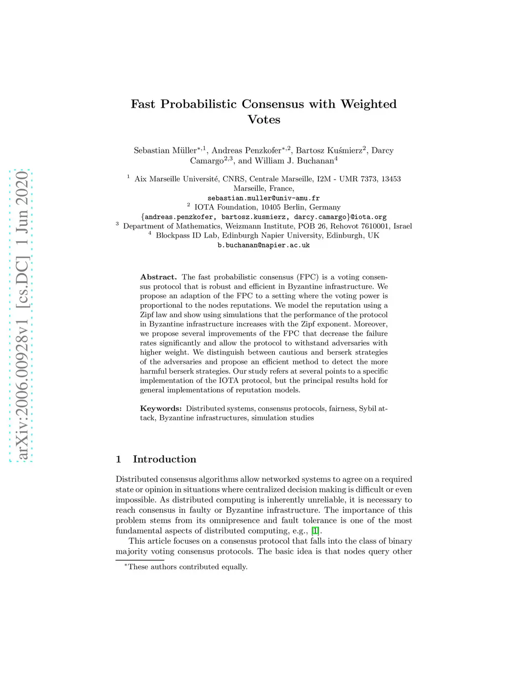 The fast probabilistic consensus (FPC) is a voting consensus protocol that is robust and efficient in Byzantine infrastructure. We propose an adaption of the FPC to a setting where the voting power is proportional to the nodes reputations. We model the reputation using a Zipf law and show using simulations that the performance of the protocol in Byzantine infrastructure increases with the Zipf exponent. Moreover, we propose several improvements of the FPC that decrease the failure rates significantly and allow the protocol to withstand adversaries with higher weight. We distinguish between cautious and berserk strategies of the adversaries and propose an efficient method to detect the more harmful berserk strategies. Our study refers at several points to a specific implementation of the IOTA protocol, but the principal results hold for general implementations of reputation models.