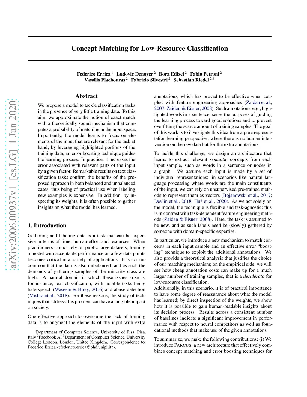 We propose a model to tackle classification tasks in the presence of very little training data. To this aim, we approximate the notion of exact match with a theoretically sound mechanism that computes a probability of matching in the input space. Importantly, the model learns to focus on elements of the input that are relevant for the task at hand; by leveraging highlighted portions of the training data, an error boosting technique guides the learning process. In practice, it increases the error associated with relevant parts of the input by a given factor. Remarkable results on text classification tasks confirm the benefits of the proposed approach in both balanced and unbalanced cases, thus being of practical use when labeling new examples is expensive. In addition, by inspecting its weights, it is often possible to gather insights on what the model has learned.