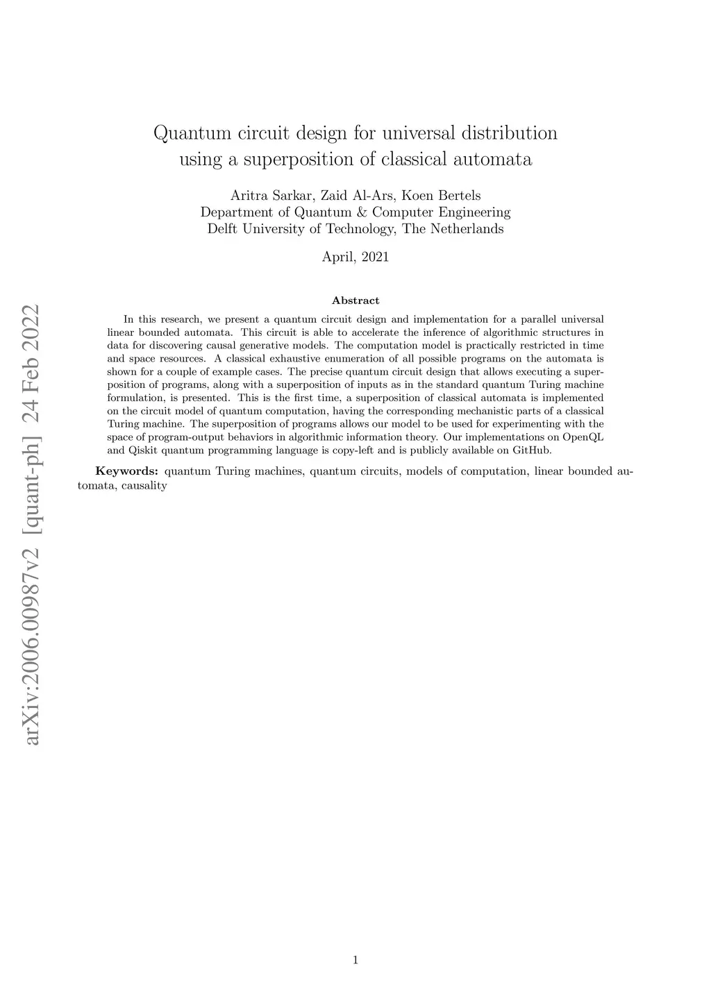 In this research, we present a quantum circuit design and implementation for a parallel universal linear bounded automata. This circuit is able to accelerate the inference of algorithmic structures in data for discovering causal generative models. The computation model is practically restricted in time and space resources. A classical exhaustive enumeration of all possible programs on the automata is shown for a couple of example cases. The precise quantum circuit design that allows executing a superposition of programs, along with a superposition of inputs as in the standard quantum Turing machine formulation, is presented. This is the first time, a superposition of classical automata is implemented on the circuit model of quantum computation, having the corresponding mechanistic parts of a classical Turing machine. The superposition of programs allows our model to be used for experimenting with the space of program-output behaviors in algorithmic information theory. Our implementations on OpenQL and Qiskit quantum programming language is copy-left and is publicly available on GitHub.