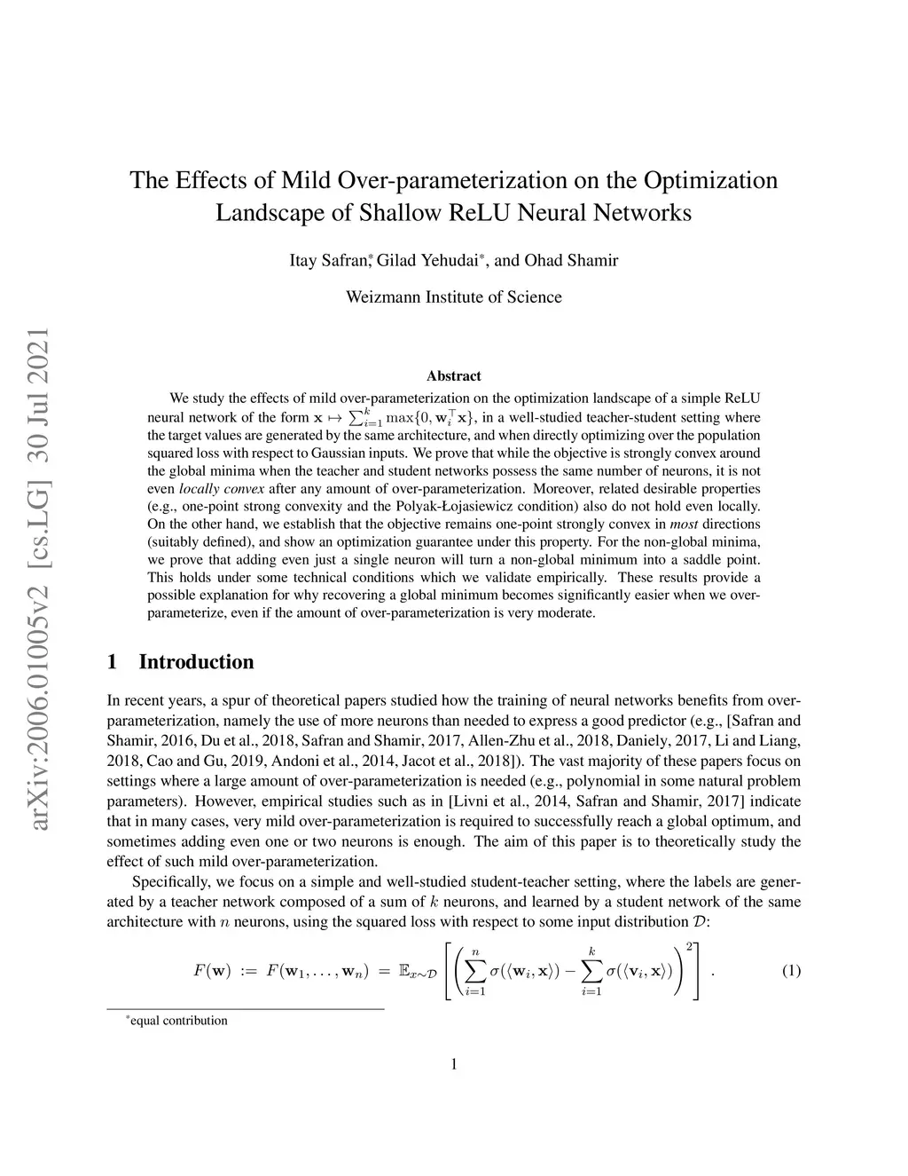 We study the effects of mild over-parameterization on the optimization landscape of a simple ReLU neural network of the form , in a well-studied teacher-student setting where the target values are generated by the same architecture, and when directly optimizing over the population squared loss with respect to Gaussian inputs. We prove that while the objective is strongly convex around the global minima when the teacher and student networks possess the same number of neurons, it is not even \emph{locally convex} after any amount of over-parameterization. Moreover, related desirable properties (e.g., one-point strong convexity and the Polyak-{\L}ojasiewicz condition) also do not hold even locally. On the other hand, we establish that the objective remains one-point strongly convex in \emph{most} directions (suitably defined), and show an optimization guarantee under this property. For the non-global minima, we prove that adding even just a single neuron will turn a non-global minimum into a saddle point. This holds under some technical conditions which we validate empirically. These results provide a possible explanation for why recovering a global minimum becomes significantly easier when we over-parameterize, even if the amount of over-parameterization is very moderate.