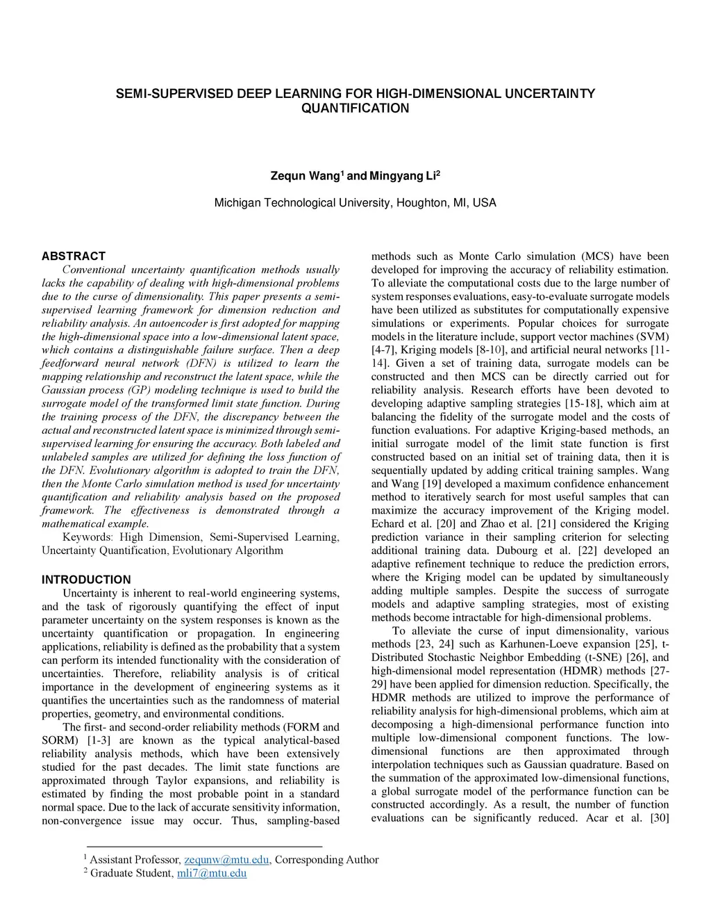 Conventional uncertainty quantification methods usually lacks the capability of dealing with high-dimensional problems due to the curse of dimensionality. This paper presents a semi-supervised learning framework for dimension reduction and reliability analysis. An autoencoder is first adopted for mapping the high-dimensional space into a low-dimensional latent space, which contains a distinguishable failure surface. Then a deep feedforward neural network (DFN) is utilized to learn the mapping relationship and reconstruct the latent space, while the Gaussian process (GP) modeling technique is used to build the surrogate model of the transformed limit state function. During the training process of the DFN, the discrepancy between the actual and reconstructed latent space is minimized through semi-supervised learning for ensuring the accuracy. Both labeled and unlabeled samples are utilized for defining the loss function of the DFN. Evolutionary algorithm is adopted to train the DFN, then the Monte Carlo simulation method is used for uncertainty quantification and reliability analysis based on the proposed framework. The effectiveness is demonstrated through a mathematical example.