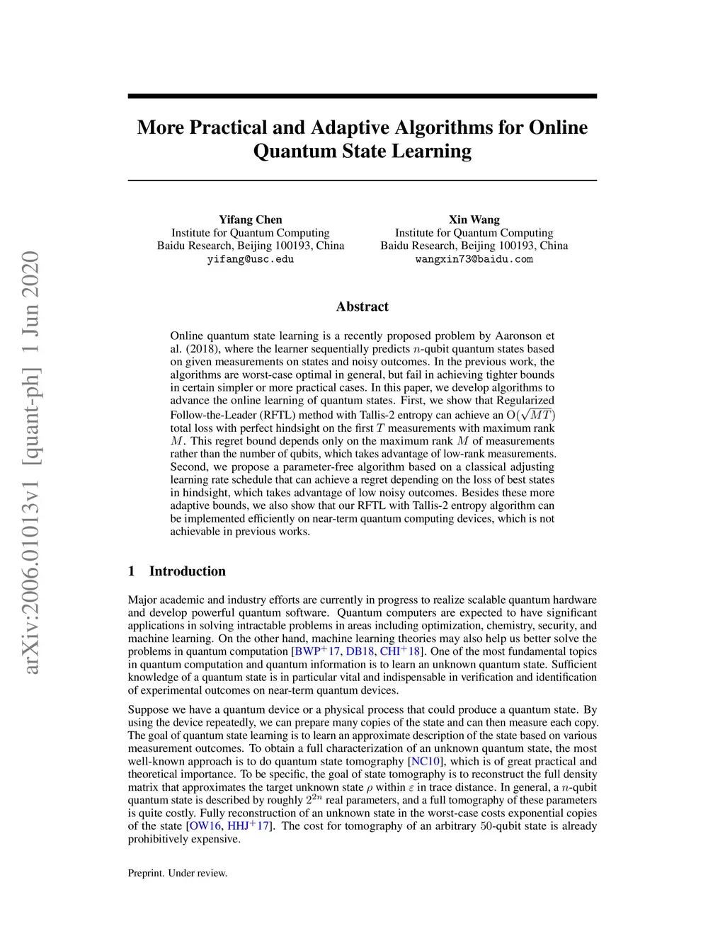 Online quantum state learning is a recently proposed problem by Aaronson et al. (2018), where the learner sequentially predicts -qubit quantum states based on given measurements on states and noisy outcomes. In the previous work, the algorithms are worst-case optimal in general but fail in achieving tighter bounds in certain simpler or more practical cases. In this paper, we develop algorithms to advance the online learning of quantum states. First, we show that Regularized Follow-the-Leader (RFTL) method with Tallis-2 entropy can achieve an total loss with perfect hindsight on the first measurements with maximum rank . This regret bound depends only on the maximum rank of measurements rather than the number of qubits, which takes advantage of low-rank measurements. Second, we propose a parameter-free algorithm based on a classical adjusting learning rate schedule that can achieve a regret depending on the loss of best states in hindsight, which takes advantage of low noisy outcomes. Besides these more adaptive bounds, we also show that our RFTL with Tallis-2 entropy algorithm can be implemented efficiently on near-term quantum computing devices, which is not achievable in previous works.