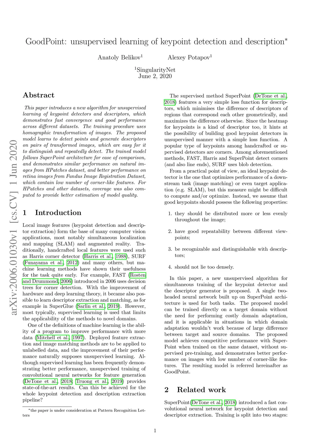 This paper introduces a new algorithm for unsupervised learning of keypoint detectors and descriptors, which demonstrates fast convergence and good performance across different datasets. The training procedure uses homographic transformation of images. The proposed model learns to detect points and generate descriptors on pairs of transformed images, which are easy for it to distinguish and repeatedly detect. The trained model follows SuperPoint architecture for ease of comparison, and demonstrates similar performance on natural images from HPatches dataset, and better performance on retina images from Fundus Image Registration Dataset, which contain low number of corner-like features. For HPatches and other datasets, coverage was also computed to provide better estimation of model quality.