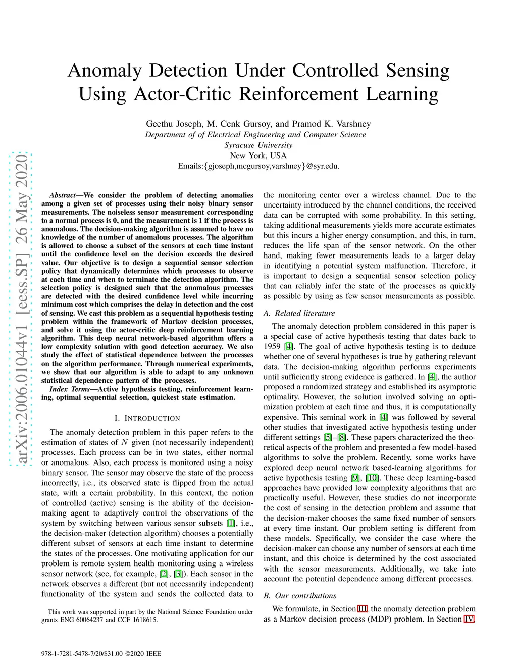 Anomaly Detection Under Controlled Sensing Using Actor-Critic