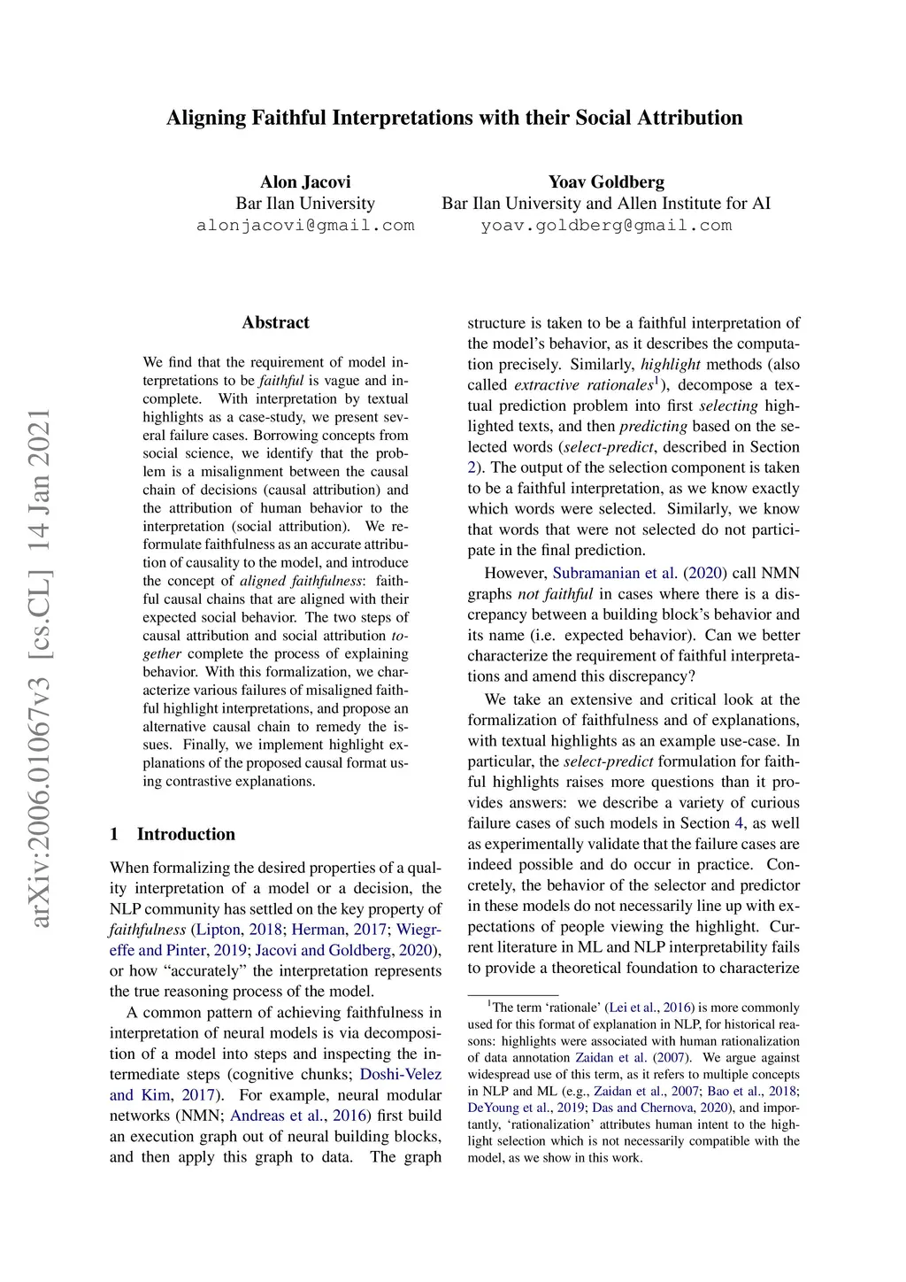 We find that the requirement of model interpretations to be faithful is vague and incomplete. With interpretation by textual highlights as a case-study, we present several failure cases. Borrowing concepts from social science, we identify that the problem is a misalignment between the causal chain of decisions (causal attribution) and the attribution of human behavior to the interpretation (social attribution). We re-formulate faithfulness as an accurate attribution of causality to the model, and introduce the concept of aligned faithfulness: faithful causal chains that are aligned with their expected social behavior. The two steps of causal attribution and social attribution together complete the process of explaining behavior. With this formalization, we characterize various failures of misaligned faithful highlight interpretations, and propose an alternative causal chain to remedy the issues. Finally, we implement highlight explanations of the proposed causal format using contrastive explanations.