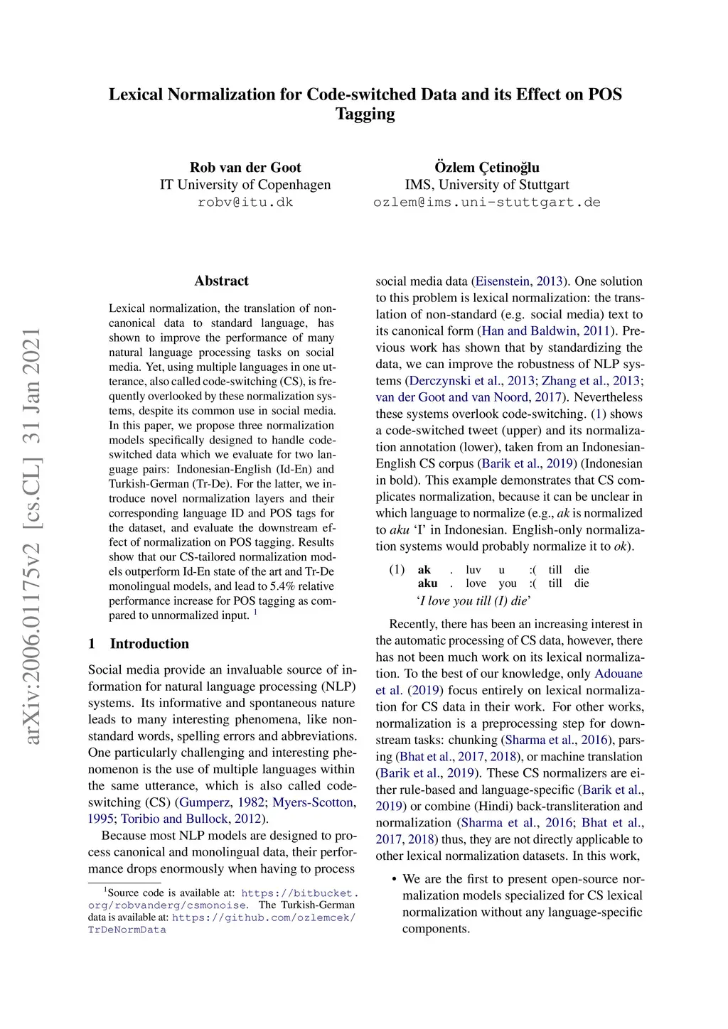 Social media provides an unfiltered stream of user-generated input, leading to creative language use and many interesting linguistic phenomena, which were previously not available so abundantly. However, this language is harder to process automatically. One particularly challenging phenomenon is the use of multiple languages within one utterance, also called Code-Switching (CS). Whereas monolingual social media data already provides many problems for natural language processing, CS adds another challenging dimension. One solution that is commonly used to improve processing of social media data is to translate input texts to standard language first. This normalization has shown to improve performance of many natural language processing tasks. In this paper, we focus on normalization in the context of code-switching. We introduce a variety of models to perform normalization on CS data, and analyse the impact of word-level language identification on normalization. We show that the performance of the proposed normalization models is generally high, but language labels are only slightly informative. We also carry out POS tagging as extrinsic evaluation and show that automatic normalization of the input leads to 3.2% absolute performance increase, whereas gold normalization leads to an increase of 6.8%.