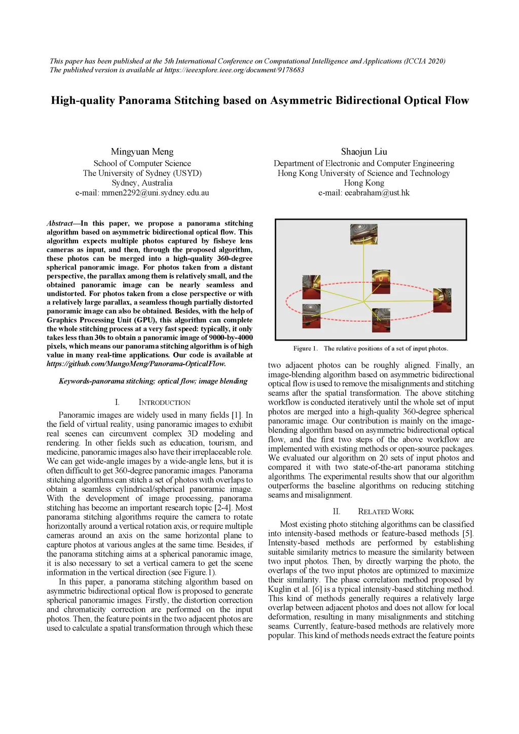 In this paper, we propose a panorama stitching algorithm based on asymmetric bidirectional optical flow. This algorithm expects multiple photos captured by fisheye lens cameras as input, and then, through the proposed algorithm, these photos can be merged into a high-quality 360-degree spherical panoramic image. For photos taken from a distant perspective, the parallax among them is relatively small, and the obtained panoramic image can be nearly seamless and undistorted. For photos taken from a close perspective or with a relatively large parallax, a seamless though partially distorted panoramic image can also be obtained. Besides, with the help of Graphics Processing Unit (GPU), this algorithm can complete the whole stitching process at a very fast speed: typically, it only takes less than 30s to obtain a panoramic image of 9000-by-4000 pixels, which means our panorama stitching algorithm is of high value in many real-time applications. Our code is available at https://github.com/MungoMeng/Panorama-OpticalFlow.