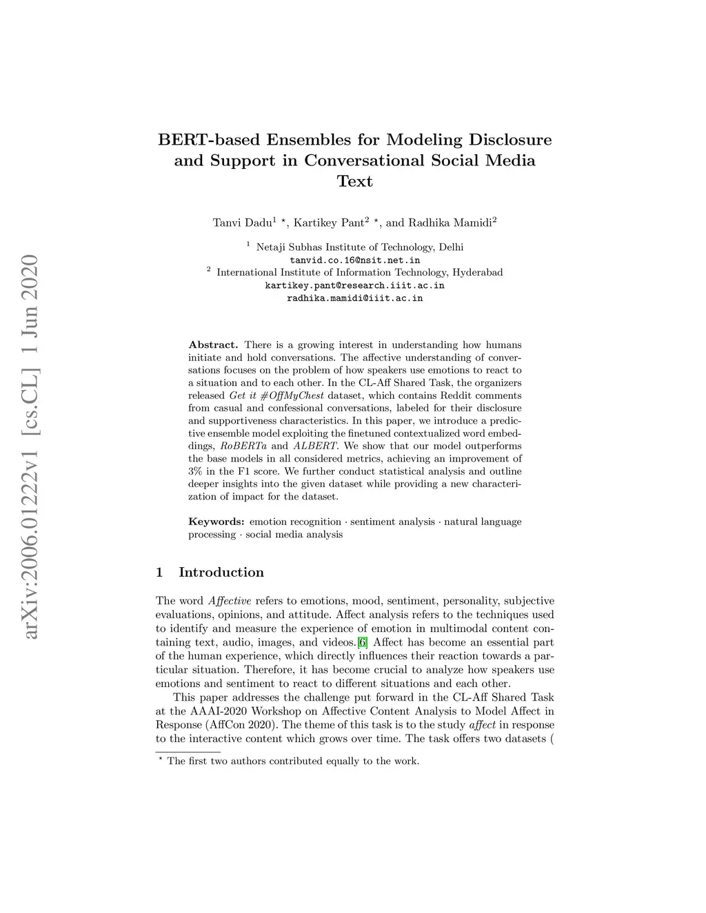 There is a growing interest in understanding how humans initiate and hold conversations. The affective understanding of conversations focuses on the problem of how speakers use emotions to react to a situation and to each other. In the CL-Aff Shared Task, the organizers released Get it #OffMyChest dataset, which contains Reddit comments from casual and confessional conversations, labeled for their disclosure and supportiveness characteristics. In this paper, we introduce a predictive ensemble model exploiting the finetuned contextualized word embeddings, RoBERTa and ALBERT. We show that our model outperforms the base models in all considered metrics, achieving an improvement of in the F1 score. We further conduct statistical analysis and outline deeper insights into the given dataset while providing a new characterization of impact for the dataset.