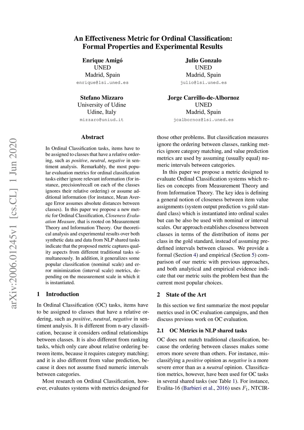 In Ordinal Classification tasks, items have to be assigned to classes that have a relative ordering, such as positive, neutral, negative in sentiment analysis. Remarkably, the most popular evaluation metrics for ordinal classification tasks either ignore relevant information (for instance, precision/recall on each of the classes ignores their relative ordering) or assume additional information (for instance, Mean Average Error assumes absolute distances between classes). In this paper we propose a new metric for Ordinal Classification, Closeness Evaluation Measure, that is rooted on Measurement Theory and Information Theory. Our theoretical analysis and experimental results over both synthetic data and data from NLP shared tasks indicate that the proposed metric captures quality aspects from different traditional tasks simultaneously. In addition, it generalizes some popular classification (nominal scale) and error minimization (interval scale) metrics, depending on the measurement scale in which it is instantiated.