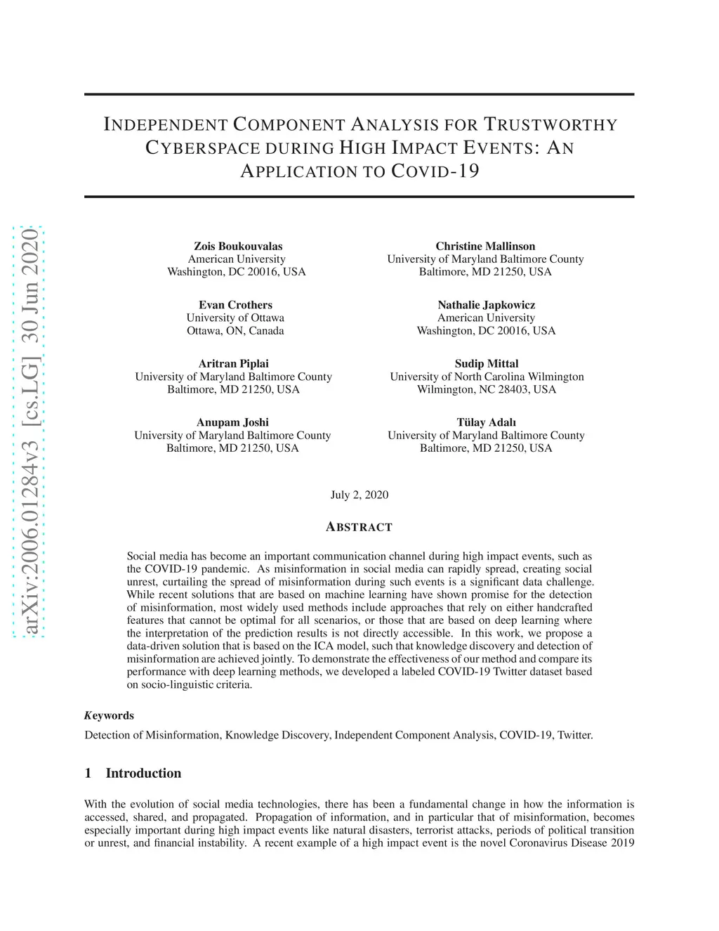 Social media has become an important communication channel during high impact events, such as the COVID-19 pandemic. As misinformation in social media can rapidly spread, creating social unrest, curtailing the spread of misinformation during such events is a significant data challenge. While recent solutions that are based on machine learning have shown promise for the detection of misinformation, most widely used methods include approaches that rely on either handcrafted features that cannot be optimal for all scenarios, or those that are based on deep learning where the interpretation of the prediction results is not directly accessible. In this work, we propose a data-driven solution that is based on the ICA model, such that knowledge discovery and detection of misinformation are achieved jointly. To demonstrate the effectiveness of our method and compare its performance with deep learning methods, we developed a labeled COVID-19 Twitter dataset based on socio-linguistic criteria.