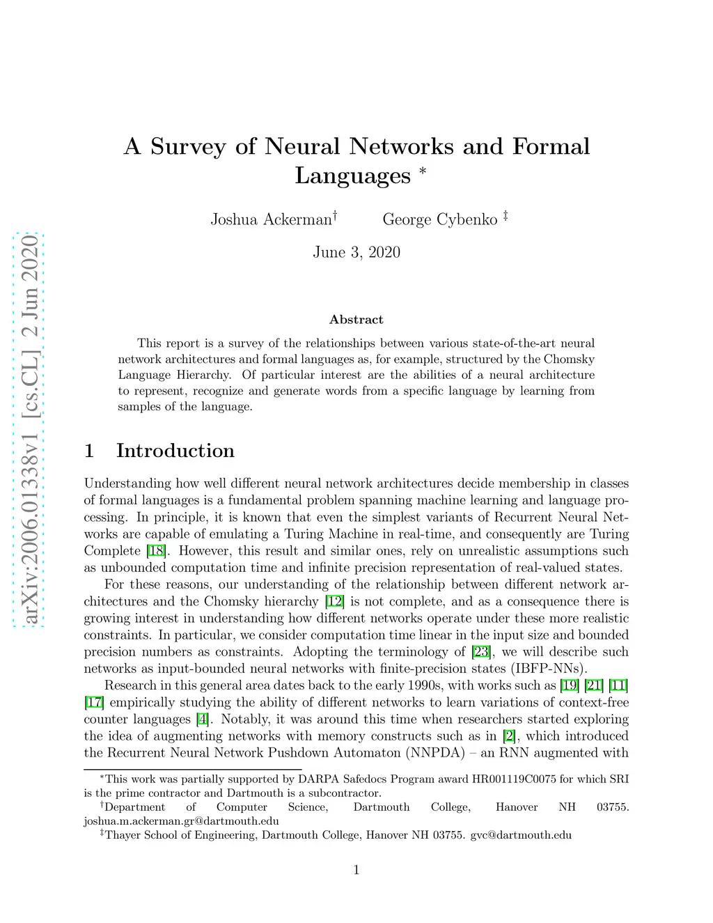 This report is a survey of the relationships between various state-of-the-art neural network architectures and formal languages as, for example, structured by the Chomsky Language Hierarchy. Of particular interest are the abilities of a neural architecture to represent, recognize and generate words from a specific language by learning from samples of the language.