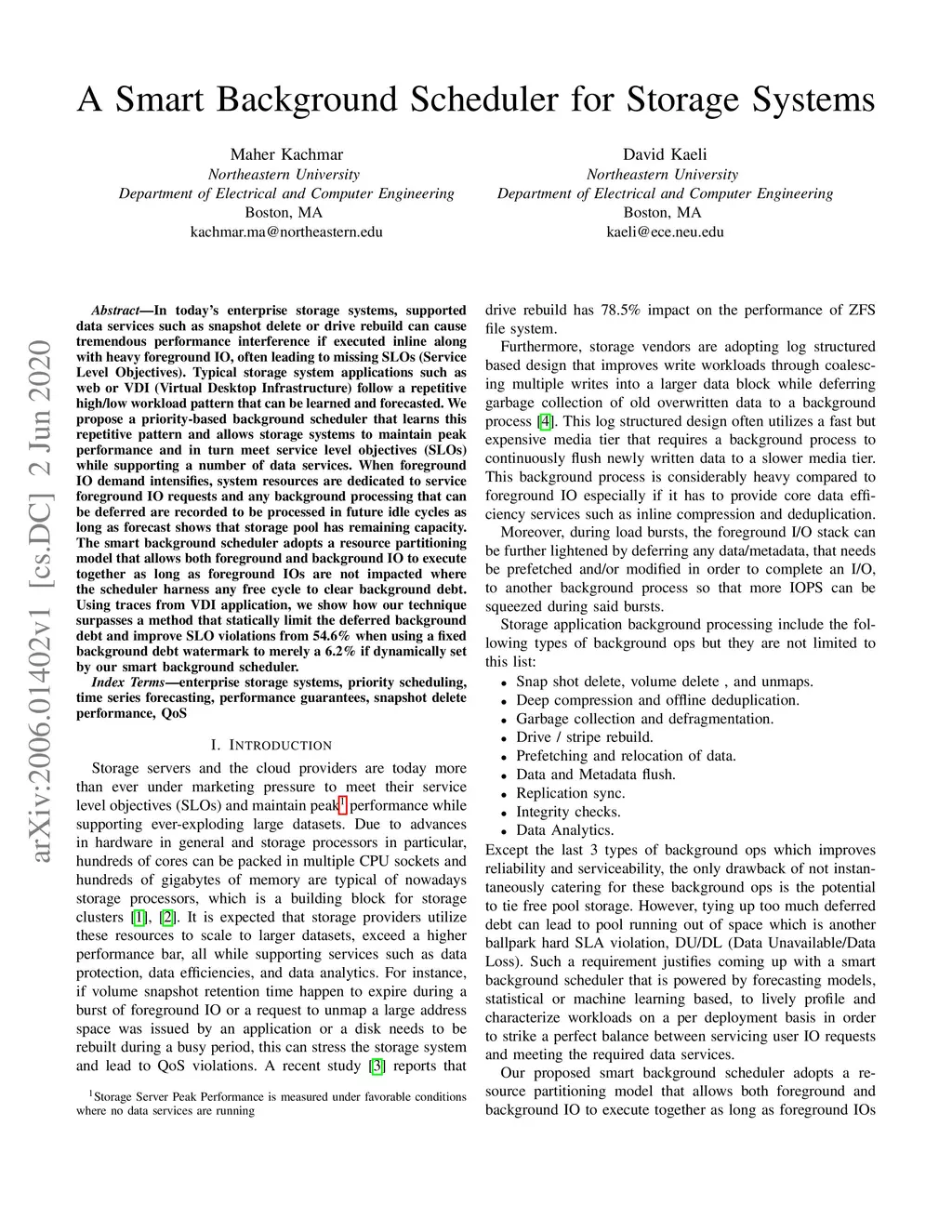 In today's enterprise storage systems, supported data services such as snapshot delete or drive rebuild can cause tremendous performance interference if executed inline along with heavy foreground IO, often leading to missing SLOs (Service Level Objectives). Typical storage system applications such as web or VDI (Virtual Desktop Infrastructure) follow a repetitive high/low workload pattern that can be learned and forecasted. We propose a priority-based background scheduler that learns this repetitive pattern and allows storage systems to maintain peak performance and in turn meet service level objectives (SLOs) while supporting a number of data services. When foreground IO demand intensifies, system resources are dedicated to service foreground IO requests and any background processing that can be deferred are recorded to be processed in future idle cycles as long as forecast shows that storage pool has remaining capacity. The smart background scheduler adopts a resource partitioning model that allows both foreground and background IO to execute together as long as foreground IOs are not impacted where the scheduler harness any free cycle to clear background debt. Using traces from VDI application, we show how our technique surpasses a method that statically limit the deferred background debt and improve SLO violations from 54.6% when using a fixed background debt watermark to merely a 6.2% if dynamically set by our smart background scheduler.