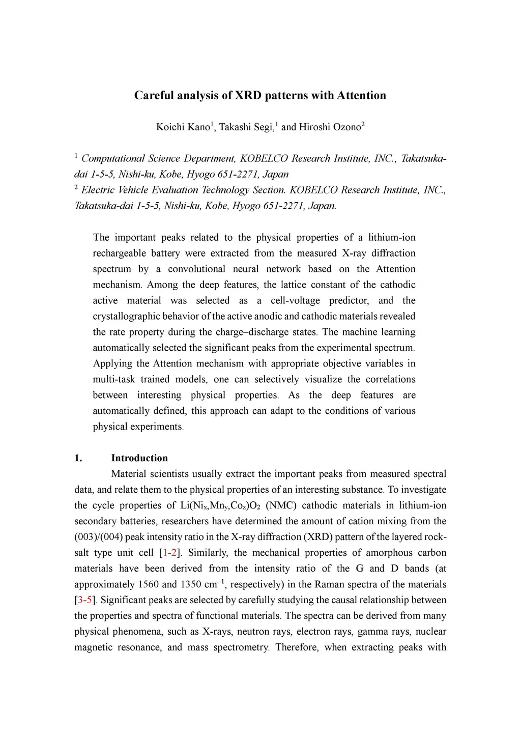 The important peaks related to the physical properties of a lithium ion rechargeable battery were extracted from the measured X ray diffraction spectrum by a convolutional neural network based on the Attention mechanism. Among the deep features, the lattice constant of the cathodic active material was selected as a cell voltage predictor, and the crystallographic behavior of the active anodic and cathodic materials revealed the rate property during the charge discharge states. The machine learning automatically selected the significant peaks from the experimental spectrum. Applying the Attention mechanism with appropriate objective variables in multi task trained models, one can selectively visualize the correlations between interesting physical properties. As the deep features are automatically defined, this approach can adapt to the conditions of various physical experiments.