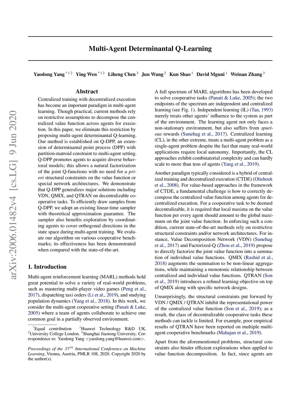 Centralized training with decentralized execution has become an important paradigm in multi-agent learning. Though practical, current methods rely on restrictive assumptions to decompose the centralized value function across agents for execution. In this paper, we eliminate this restriction by proposing multi-agent determinantal Q-learning. Our method is established on Q-DPP, an extension of determinantal point process (DPP) with partition-matroid constraint to multi-agent setting. Q-DPP promotes agents to acquire diverse behavioral models; this allows a natural factorization of the joint Q-functions with no need for \emph{a priori} structural constraints on the value function or special network architectures. We demonstrate that Q-DPP generalizes major solutions including VDN, QMIX, and QTRAN on decentralizable cooperative tasks. To efficiently draw samples from Q-DPP, we adopt an existing sample-by-projection sampler with theoretical approximation guarantee. The sampler also benefits exploration by coordinating agents to cover orthogonal directions in the state space during multi-agent training. We evaluate our algorithm on various cooperative benchmarks; its effectiveness has been demonstrated when compared with the state-of-the-art.