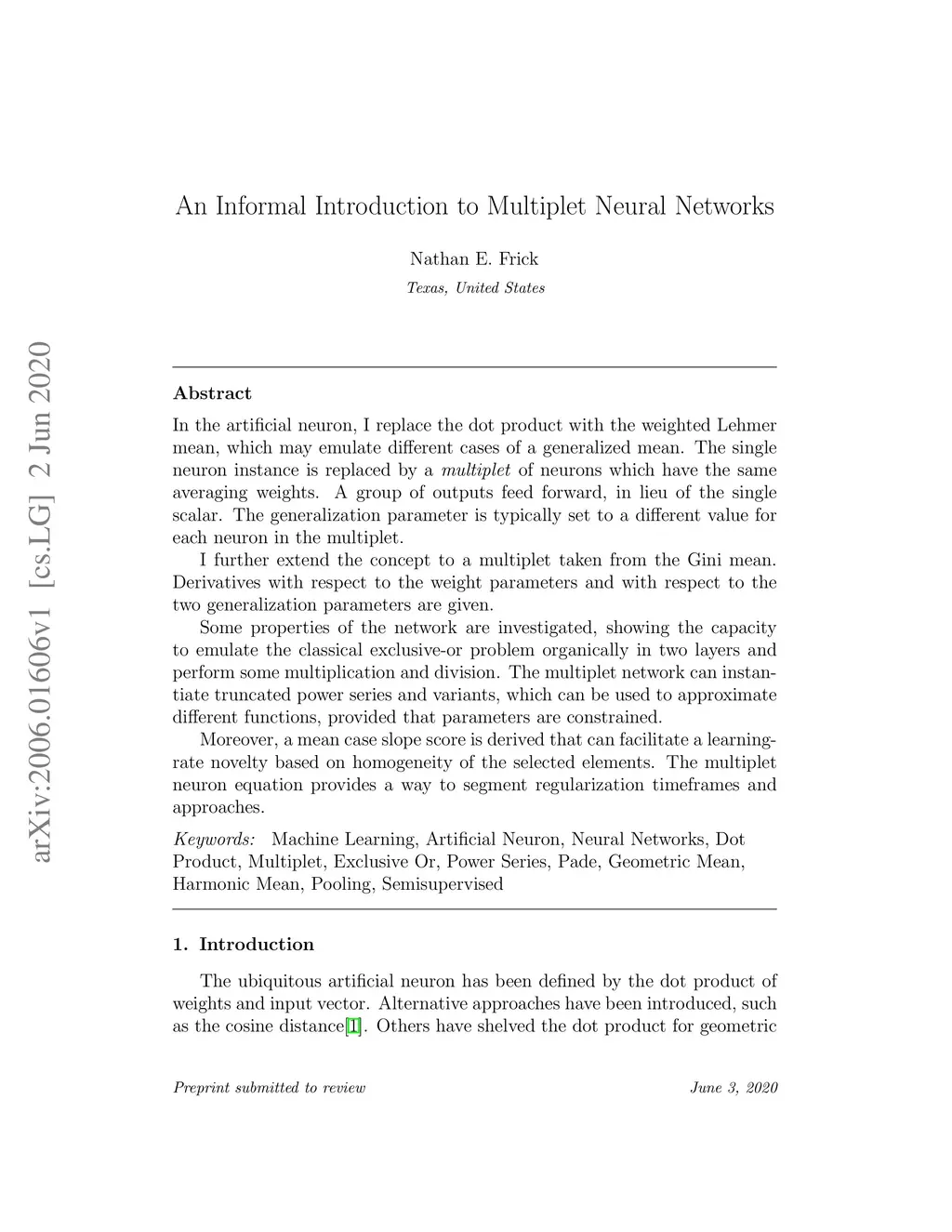 In the artificial neuron, I replace the dot product with the weighted Lehmer mean, which may emulate different cases of a generalized mean. The single neuron instance is replaced by a multiplet of neurons which have the same averaging weights. A group of outputs feed forward, in lieu of the single scalar. The generalization parameter is typically set to a different value for each neuron in the multiplet. I further extend the concept to a multiplet taken from the Gini mean. Derivatives with respect to the weight parameters and with respect to the two generalization parameters are given. Some properties of the network are investigated, showing the capacity to emulate the classical exclusive-or problem organically in two layers and perform some multiplication and division. The network can instantiate truncated power series and variants, which can be used to approximate different functions, provided that parameters are constrained. Moreover, a mean case slope score is derived that can facilitate a learning-rate novelty based on homogeneity of the selected elements. The multiplet neuron equation provides a way to segment regularization timeframes and approaches.