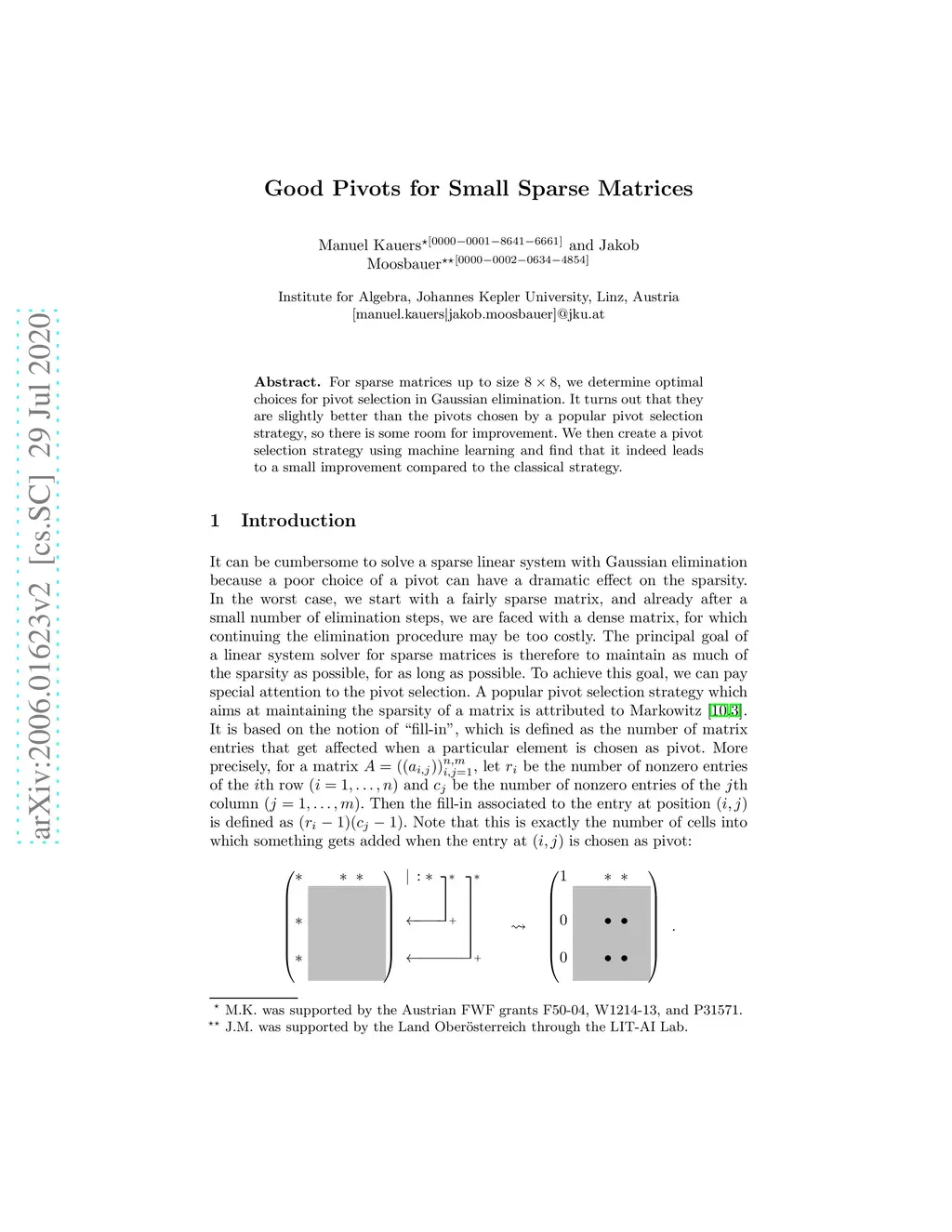 For sparse matrices up to size , we determine optimal choices for pivot selection in Gaussian elimination. It turns out that they are slightly better than the pivots chosen by a popular pivot selection strategy, so there is some room for improvement. We then create a pivot selection strategy using machine learning and find that it indeed leads to a small improvement compared to the classical strategy.