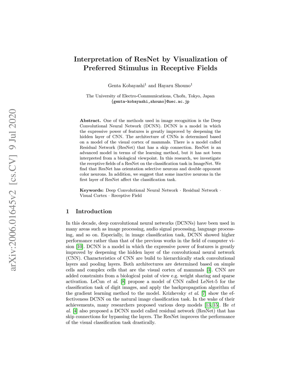 One of the methods used in image recognition is the Deep Convolutional Neural Network (DCNN). DCNN is a model in which the expressive power of features is greatly improved by deepening the hidden layer of CNN. The architecture of CNNs is determined based on a model of the visual cortex of mammals. There is a model called Residual Network (ResNet) that has a skip connection. ResNet is an advanced model in terms of the learning method, but it has not been interpreted from a biological viewpoint. In this research, we investigate the receptive fields of a ResNet on the classification task in ImageNet. We find that ResNet has orientation selective neurons and double opponent color neurons. In addition, we suggest that some inactive neurons in the first layer of ResNet affect the classification task.