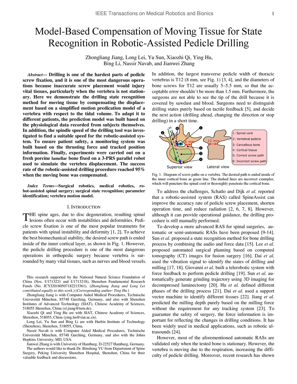 Drilling is one of the hardest parts of pedicle screw fixation, and it is one of the most dangerous operations because inaccurate screw placement would injury vital tissues, particularly when the vertebra is not stationary. Here we demonstrate the drilling state recognition method for moving tissue by compensating the displacement based on a simplified motion predication model of a vertebra with respect to the tidal volume. To adapt it to different patients, the prediction model was built based on the physiological data recorded from subjects themselves. In addition, the spindle speed of the drilling tool was investigated to find a suitable speed for the robotic-assisted system. To ensure patient safety, a monitoring system was built based on the thrusting force and tracked position information. Finally, experiments were carried out on a fresh porcine lamellar bone fixed on a 3-PRS parallel robot used to simulate the vertebra displacement. The success rate of the robotic-assisted drilling procedure reached 95% when the moving bone was compensated.