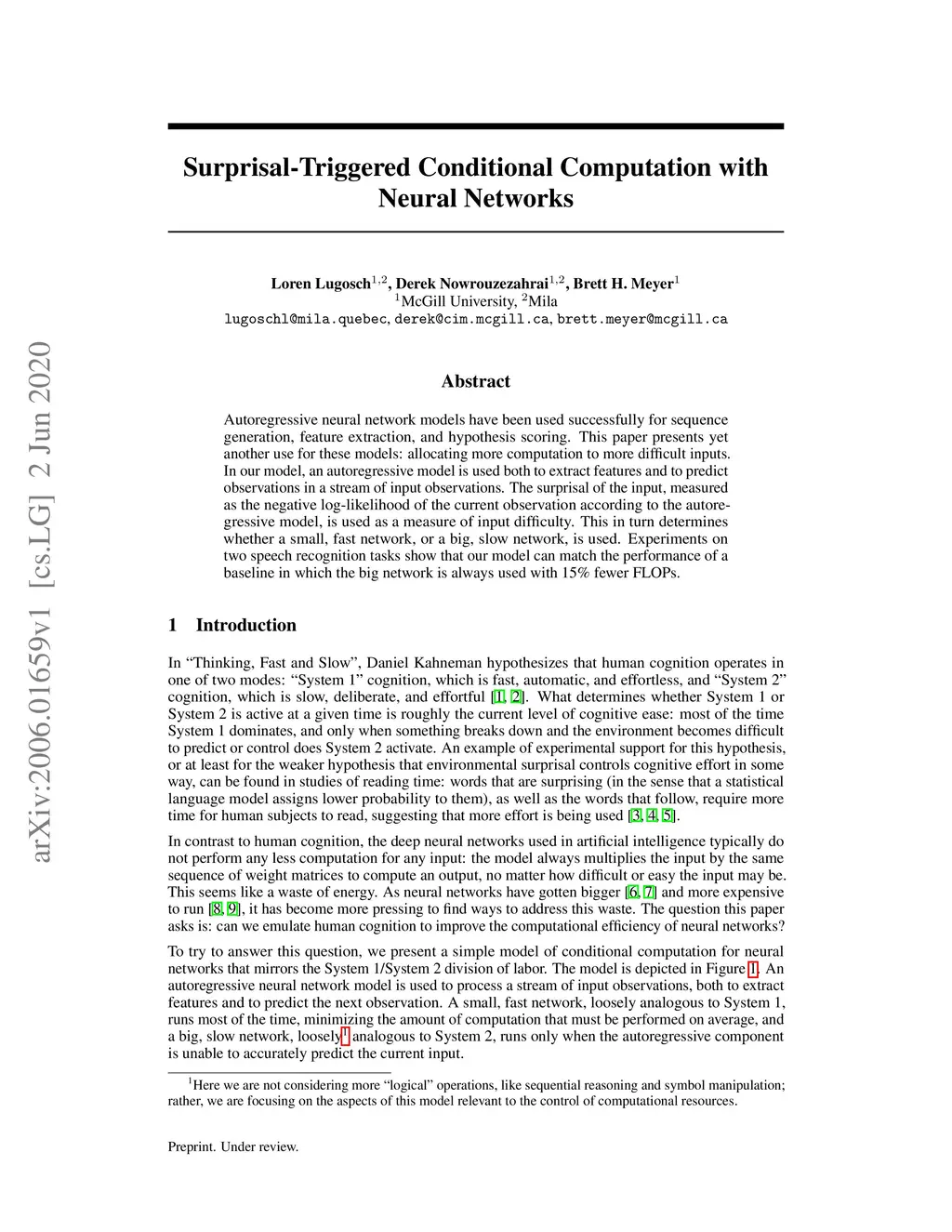 Autoregressive neural network models have been used successfully for sequence generation, feature extraction, and hypothesis scoring. This paper presents yet another use for these models: allocating more computation to more difficult inputs. In our model, an autoregressive model is used both to extract features and to predict observations in a stream of input observations. The surprisal of the input, measured as the negative log-likelihood of the current observation according to the autoregressive model, is used as a measure of input difficulty. This in turn determines whether a small, fast network, or a big, slow network, is used. Experiments on two speech recognition tasks show that our model can match the performance of a baseline in which the big network is always used with 15% fewer FLOPs.