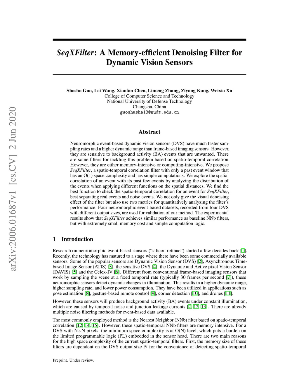 Neuromorphic event-based dynamic vision sensors (DVS) have much faster sampling rates and a higher dynamic range than frame-based imaging sensors. However, they are sensitive to background activity (BA) events that are unwanted. There are some filters for tackling this problem based on spatio-temporal correlation. However, they are either memory-intensive or computing-intensive. We propose \emph{SeqXFilter}, a spatio-temporal correlation filter with only a past event window that has an O(1) space complexity and has simple computations. We explore the spatial correlation of an event with its past few events by analyzing the distribution of the events when applying different functions on the spatial distances. We find the best function to check the spatio-temporal correlation for an event for \emph{SeqXFilter}, best separating real events and noise events. We not only give the visual denoising effect of the filter but also use two metrics for quantitatively analyzing the filter's performance. Four neuromorphic event-based datasets, recorded from four DVS with different output sizes, are used for validation of our method. The experimental results show that \emph{SeqXFilter} achieves similar performance as baseline NNb filters, but with extremely small memory cost and simple computation logic.